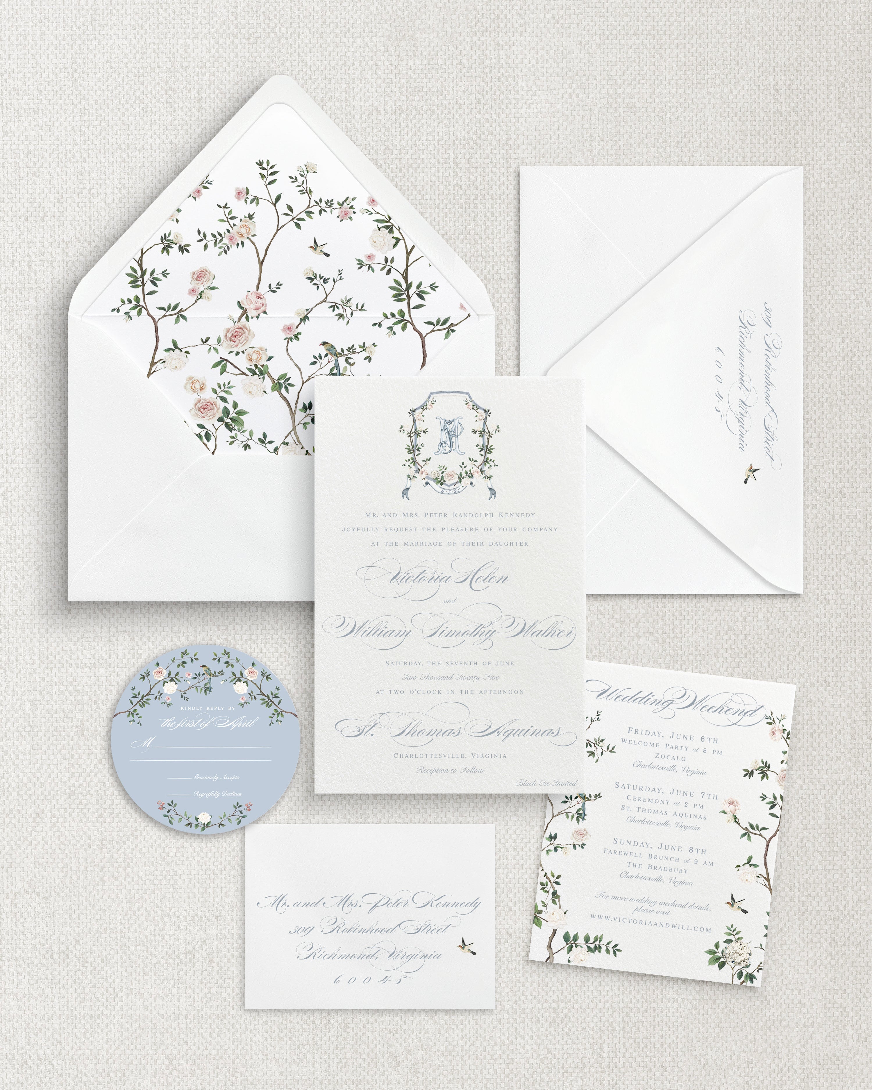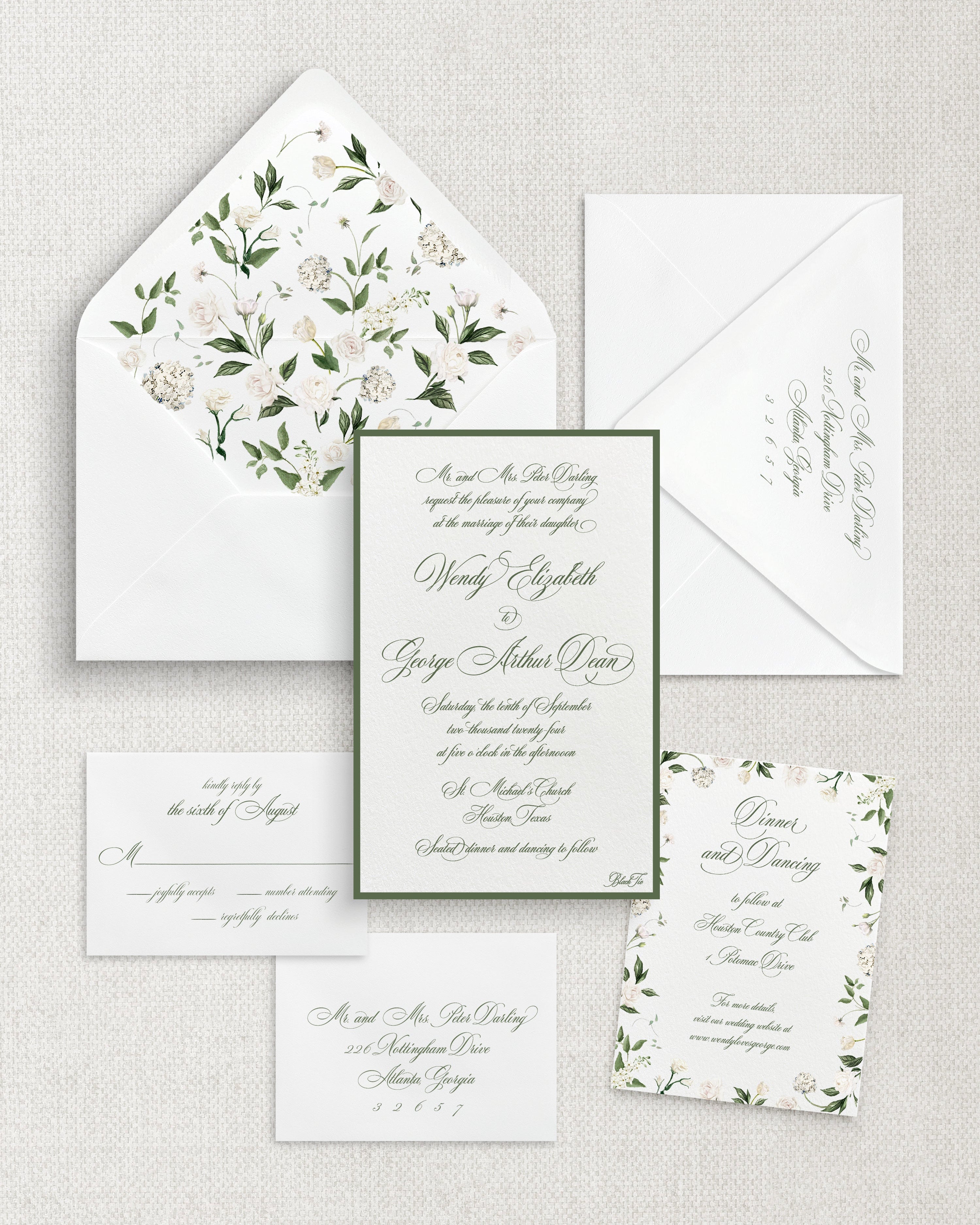 Included in each Collection Suite design is a six-piece suite, which includes the A9 Invitation, Detail Card, RSVP Card, RSVP Envelope, Invitation Envelope, and assembled Envelope Liner. Both envelopes include a printed return address.