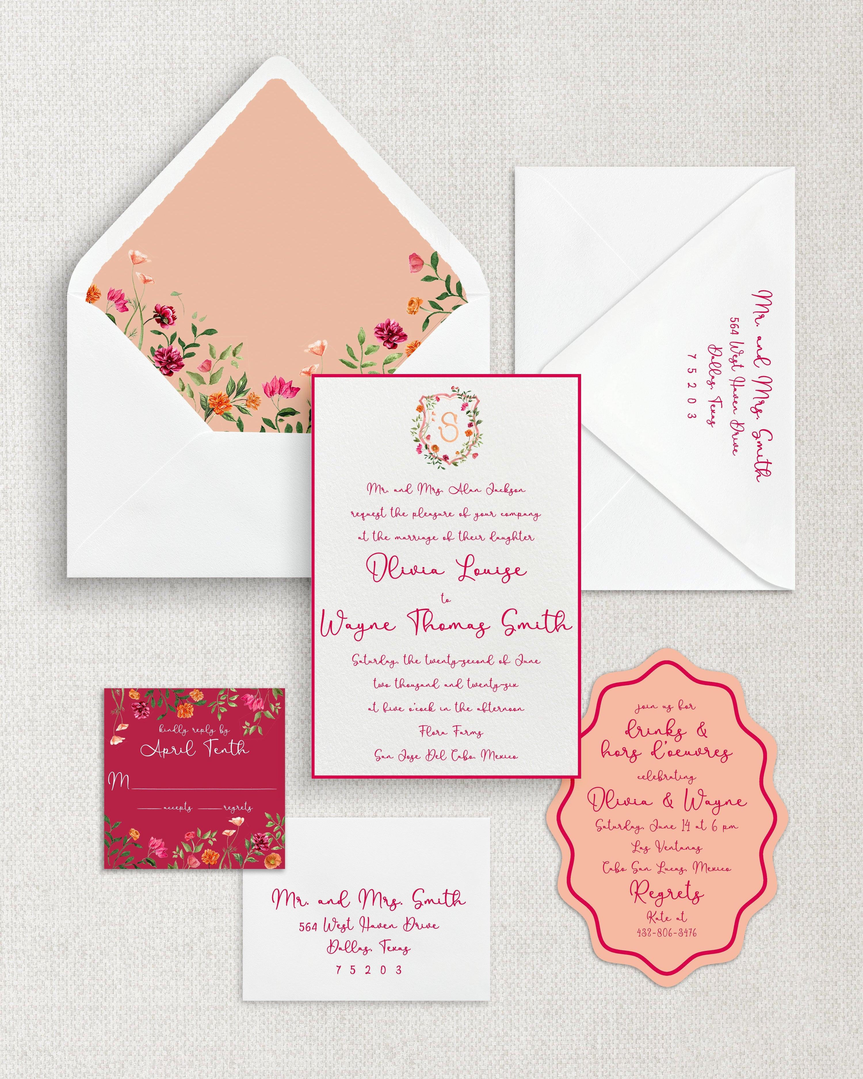 We'll customize every detail: your palette, fonts, and florals, plus optional artwork like a venue painting, wedding map, or pet illustration. You can also add special finishing touches such as colored envelopes, vellum, silk ribbon, letterpress printing or custom die cuts.
