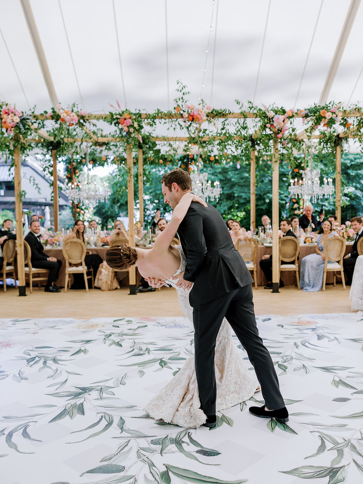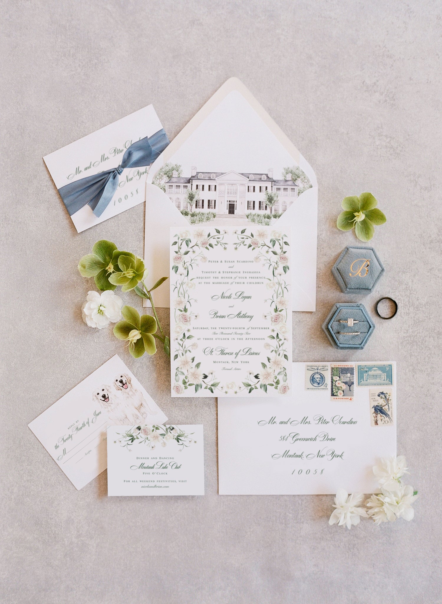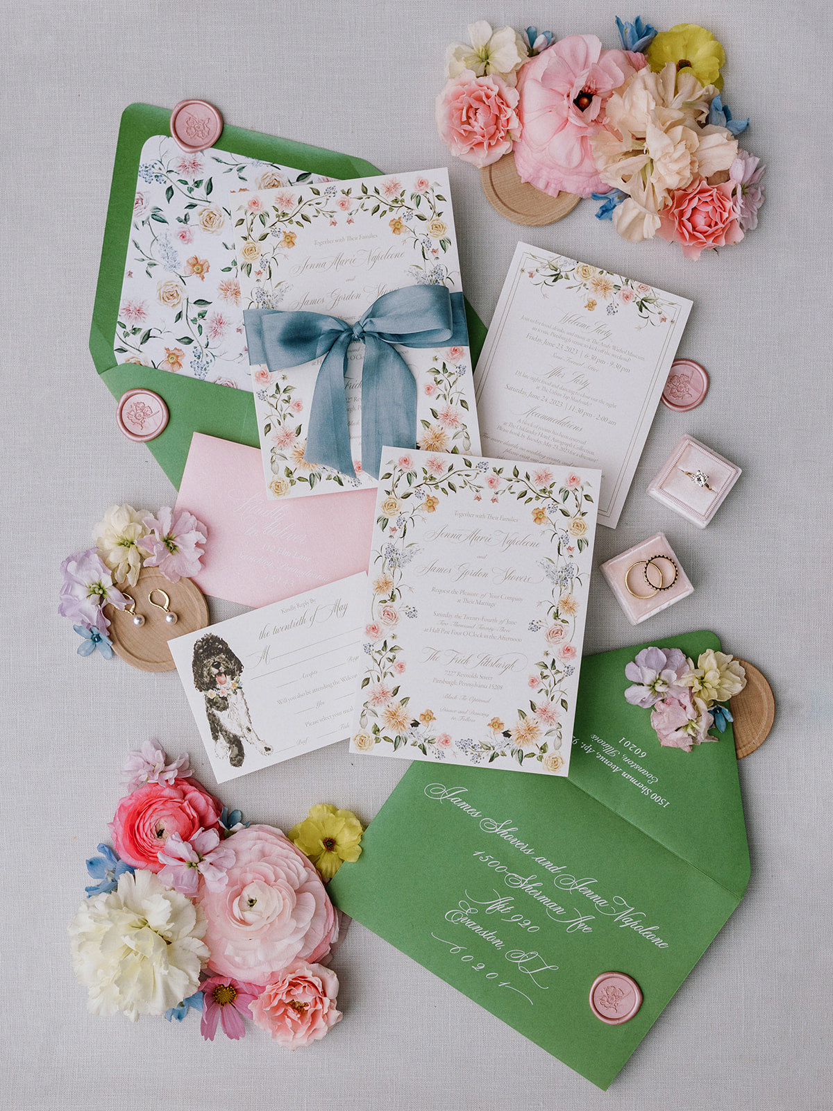 In this example of The Somerset Suite, we thoughtfully layered in personal details to create a design that was entirely unique. This suite was elevated with a custom venue painting, a new color palette and floral details, and a custom pet illustration.