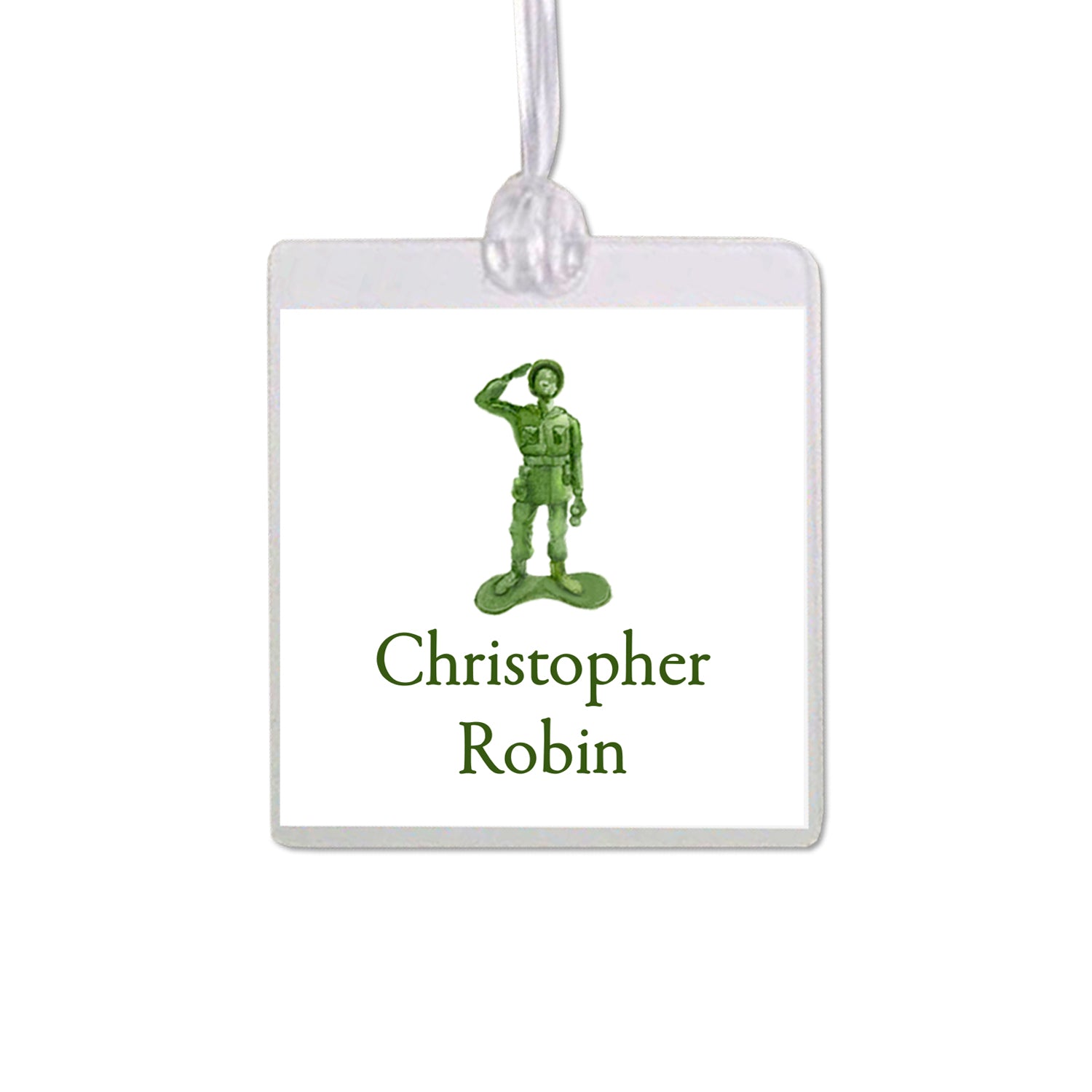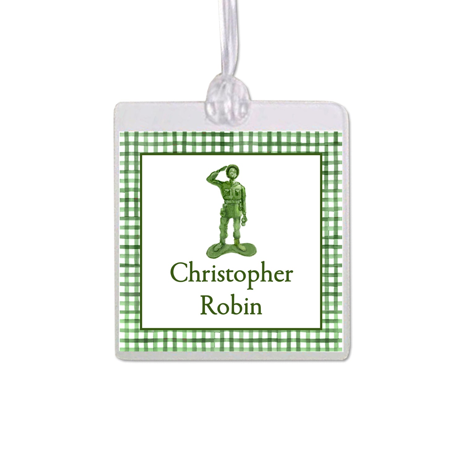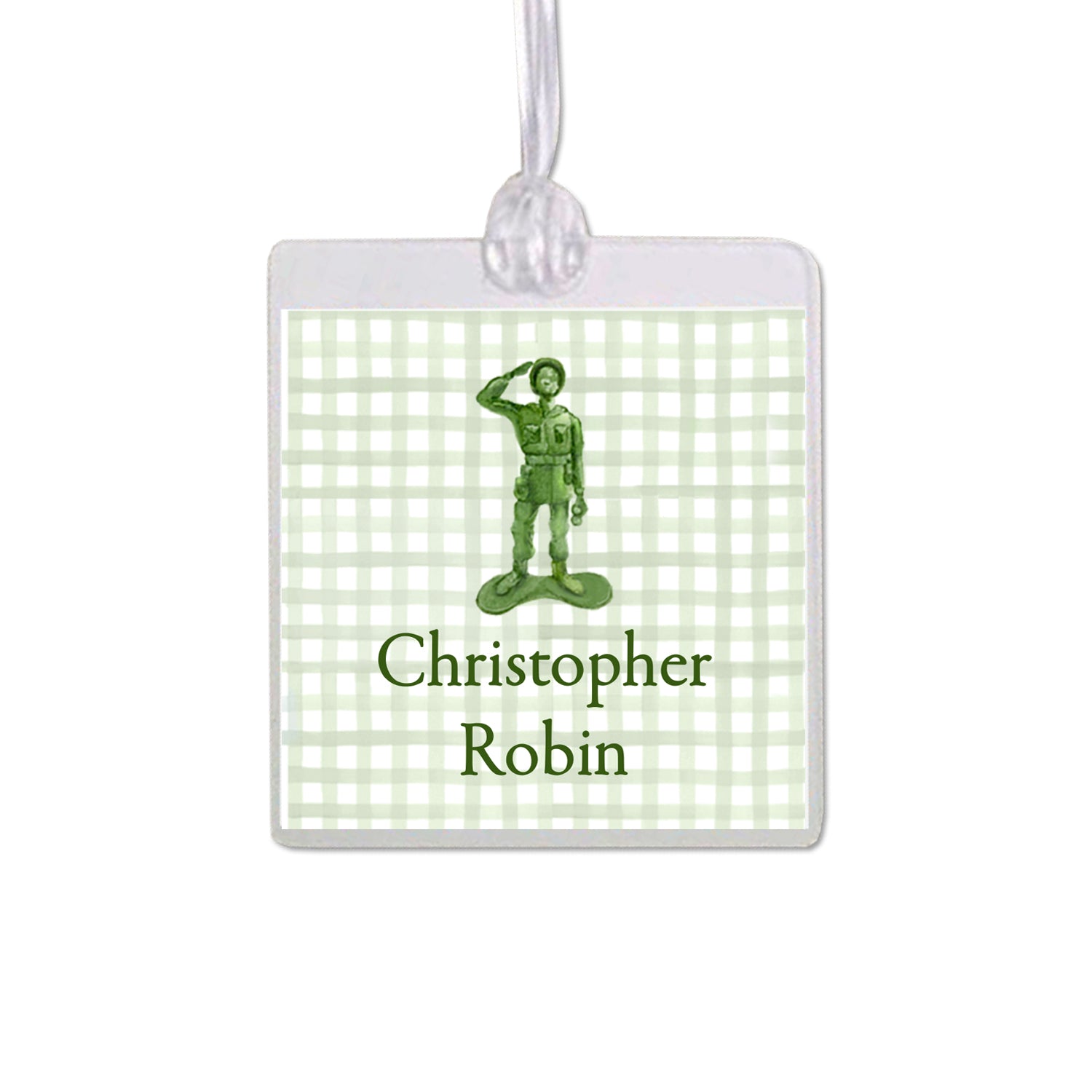 Laminated 2.75” Square bag tag printed on 110 lb. white cardstock. Also comes with a plastic lanyard for attaching to backpacks, lunch boxes, diaper bags, luggage and more! Featuring a hand-painted army man, choose from a light green gingham background, green gingham border, or solid white background with green personalization.