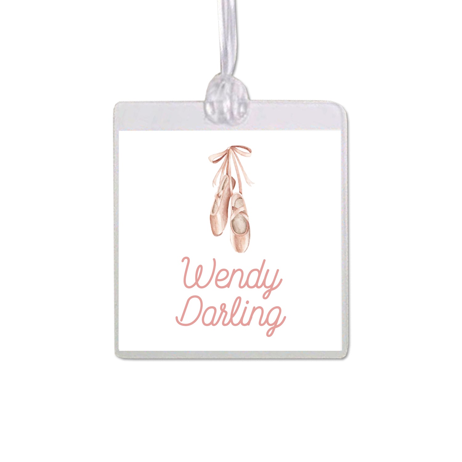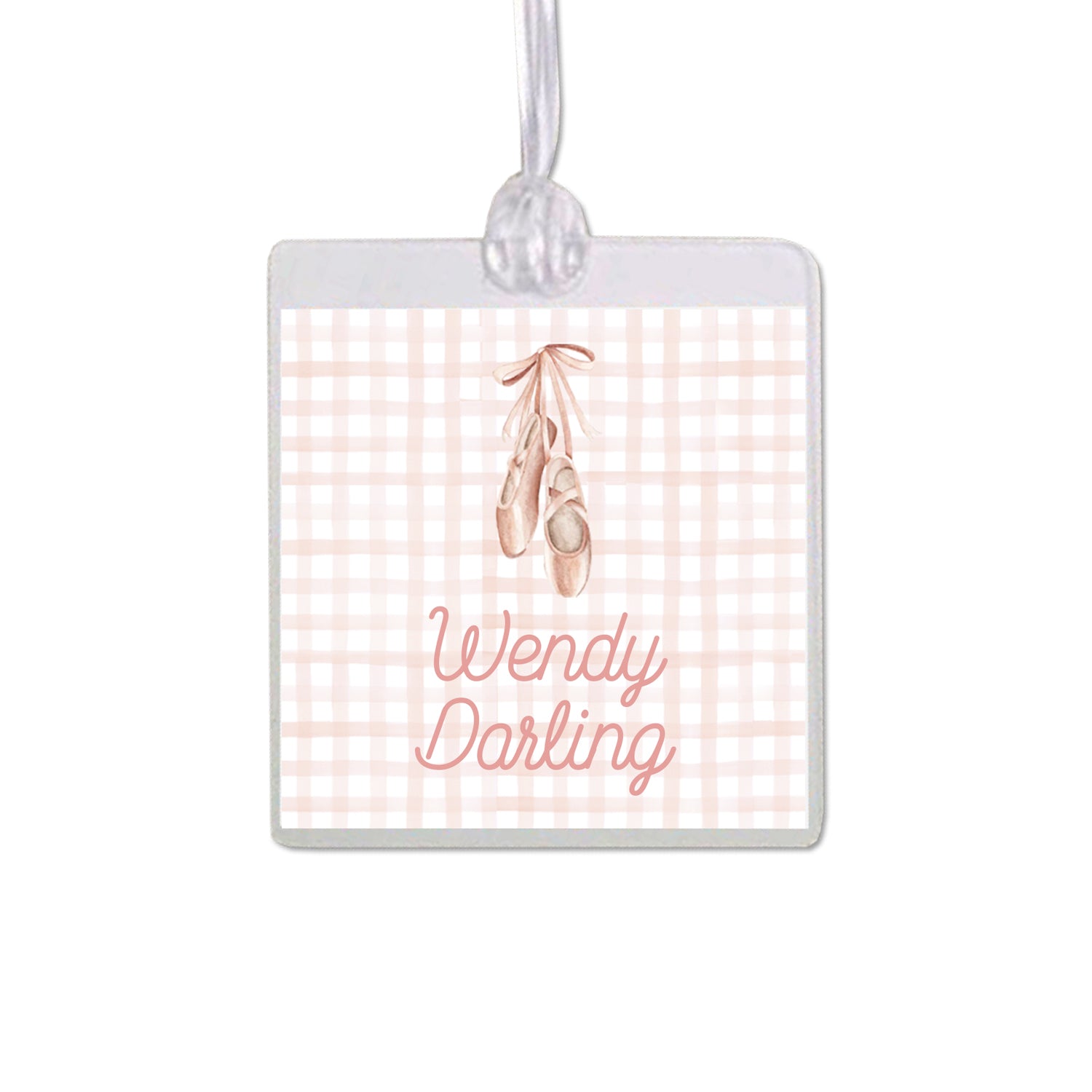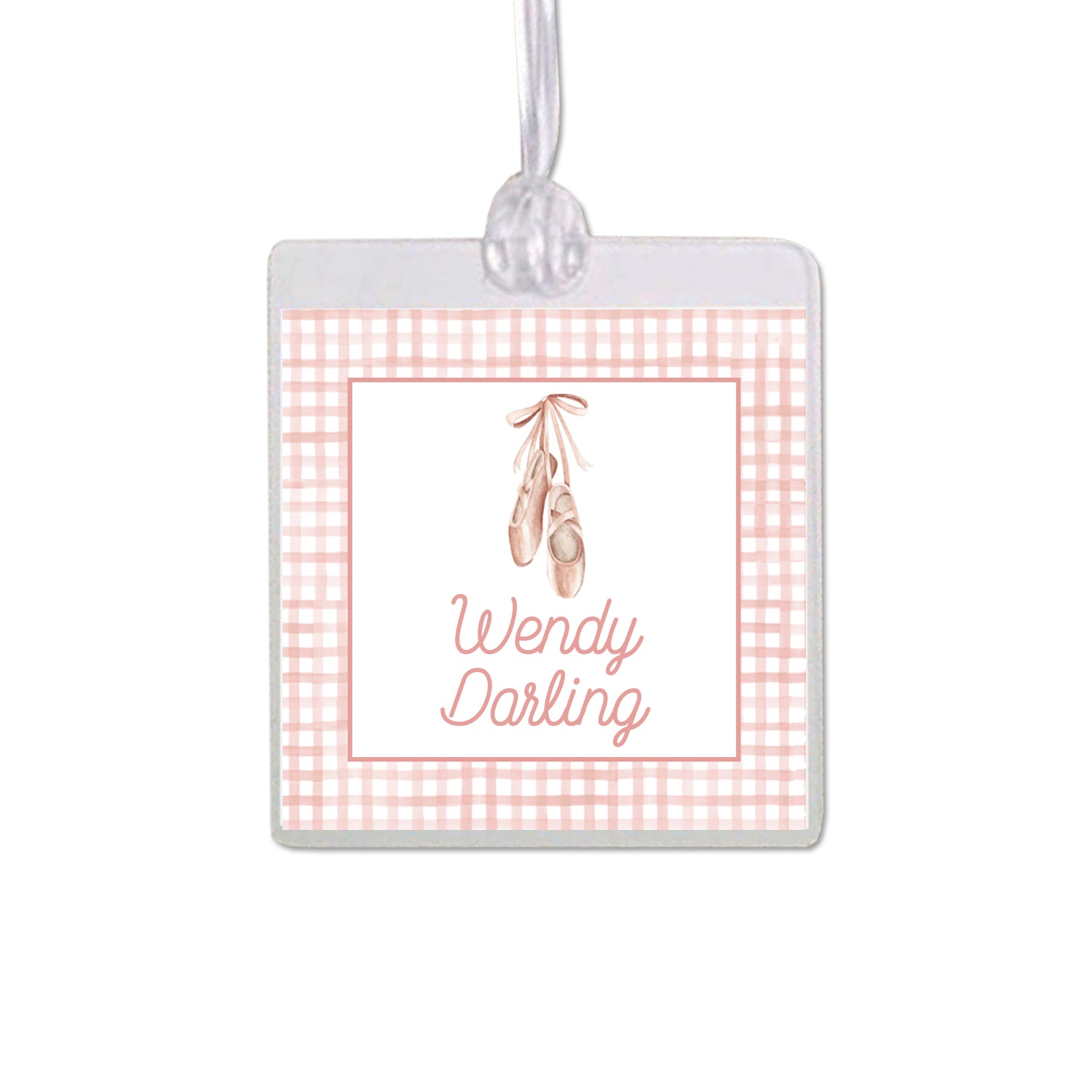 Laminated 2.75” Square bag tag printed on 110 lb. white cardstock. Also comes with a plastic lanyard for attaching to backpacks, lunch boxes, diaper bags, luggage and more! Featuring hand-painted ballet slippers, choose from a blush pink gingham background, pink gingham border, or solid white background with pink personalization.