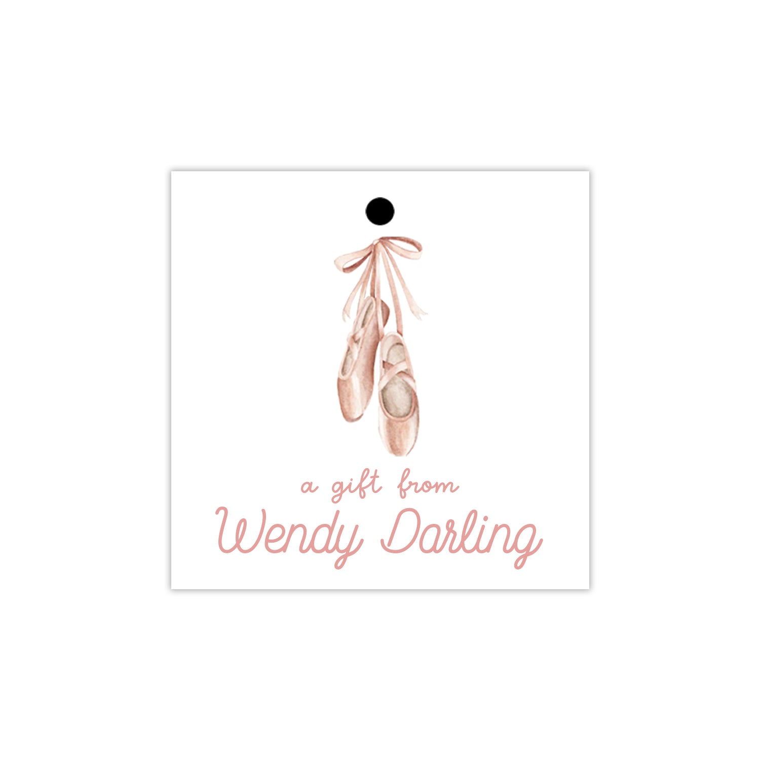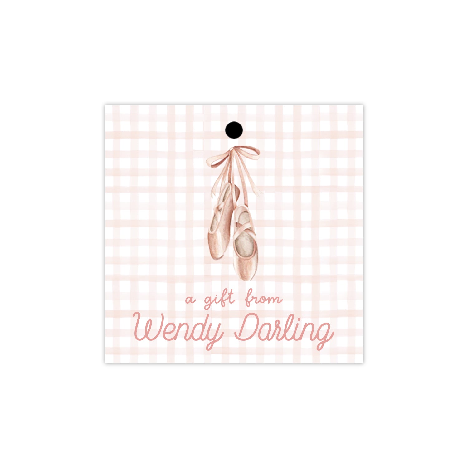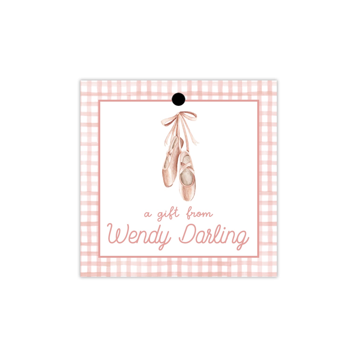 Featuring hand-painted ballet slippers and gingham, this personalized children’s gift tag is perfect for birthday parties, teacher appreciation gifts, and more. Comes with a convenient hole punch and string for easy attachment for gifting. Choose from a blush pink gingham background, pink gingham boarder, or solid white background with pink personalization.