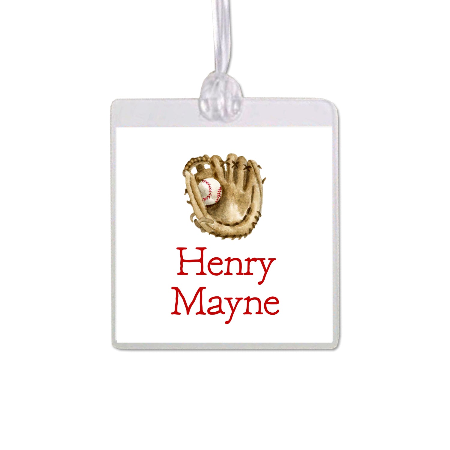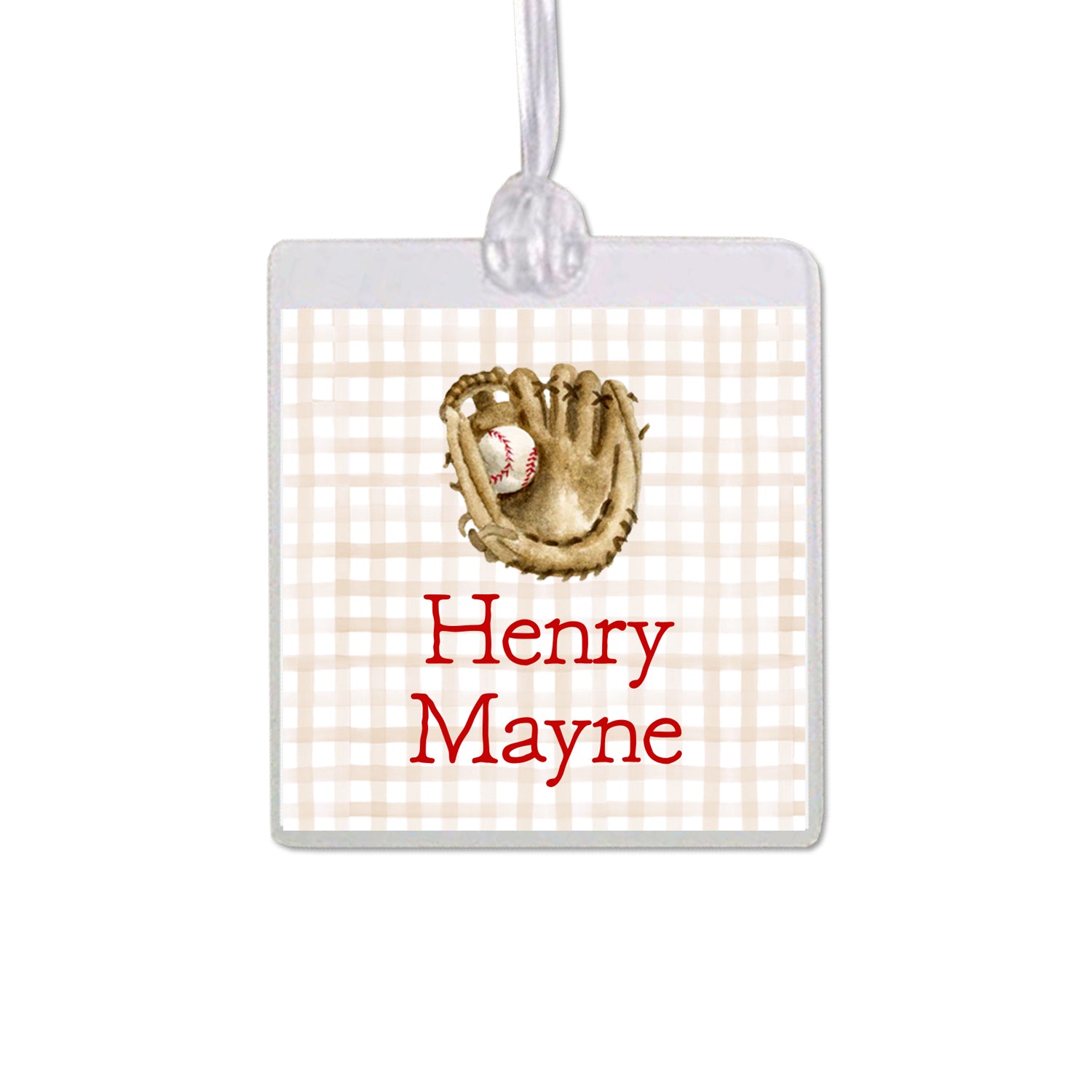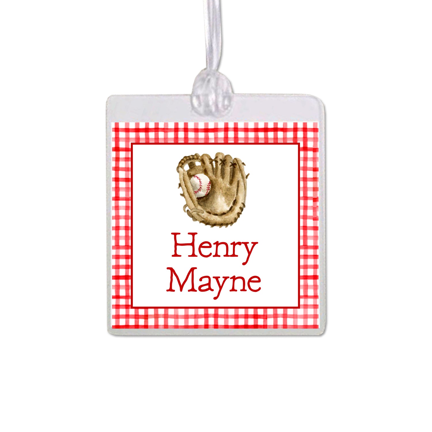 Laminated 2.75” Square bag tag printed on 110 lb. white cardstock. Also comes with a plastic lanyard for attaching to backpacks, lunch boxes, diaper bags, luggage and more! Featuring a hand-painted baseball glove, choose from a tan gingham background, red gingham border, or solid white background with red personalization.
