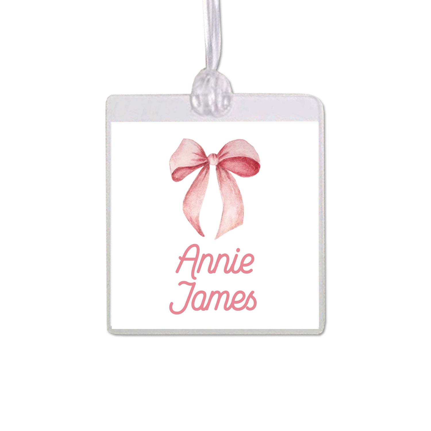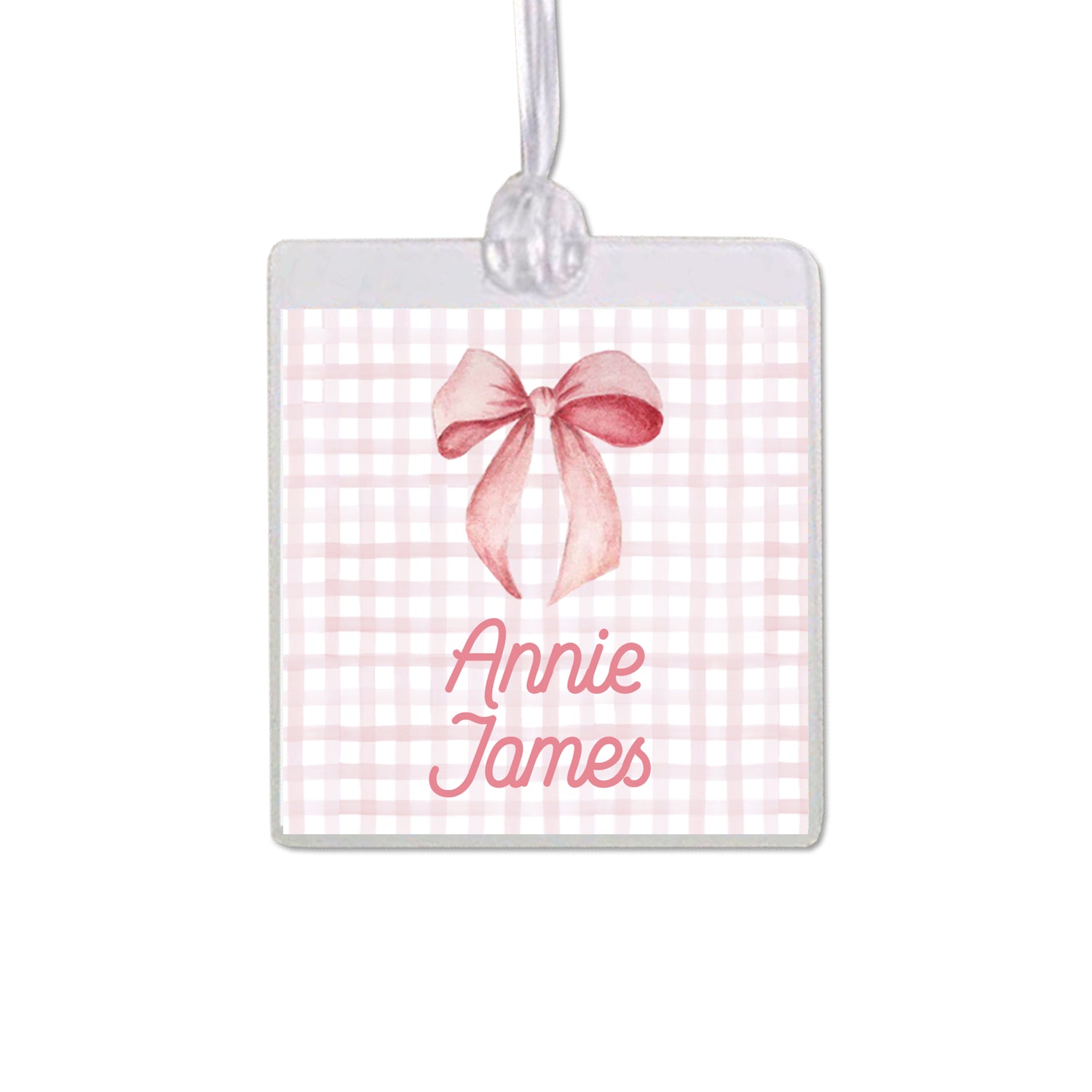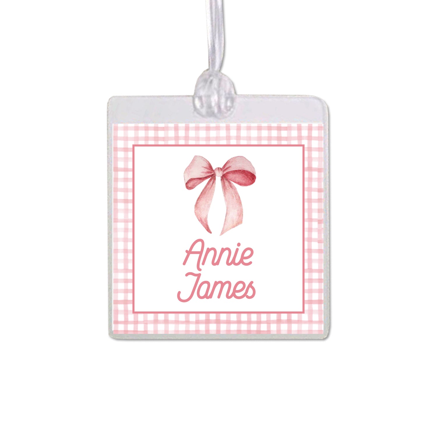 Laminated 2.75” Square bag tag printed on 110 lb. white cardstock. Also comes with a plastic lanyard for attaching to backpacks, lunch boxes, diaper bags, luggage and more! Featuring a hand-painted bow, choose from a blush pink gingham background, pink gingham border, or solid white background with pink personalization.