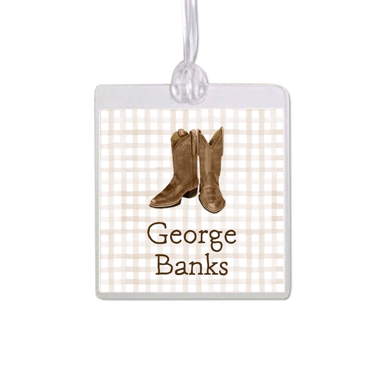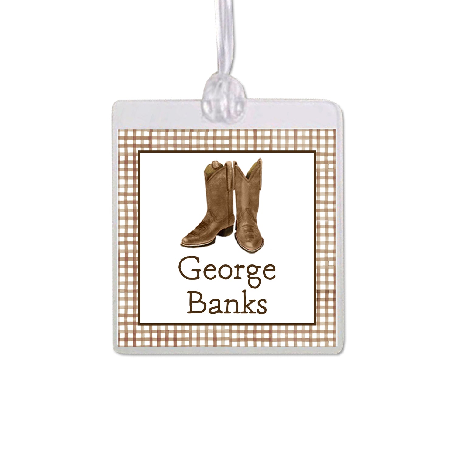 Laminated 2.75” Square bag tag printed on 110 lb. white cardstock. Also comes with a plastic lanyard for attaching to backpacks, lunch boxes, diaper bags, luggage and more! Featuring hand-painted brown boots, choose from a light brown gingham background, brown gingham border, or solid white background with brown personalization.