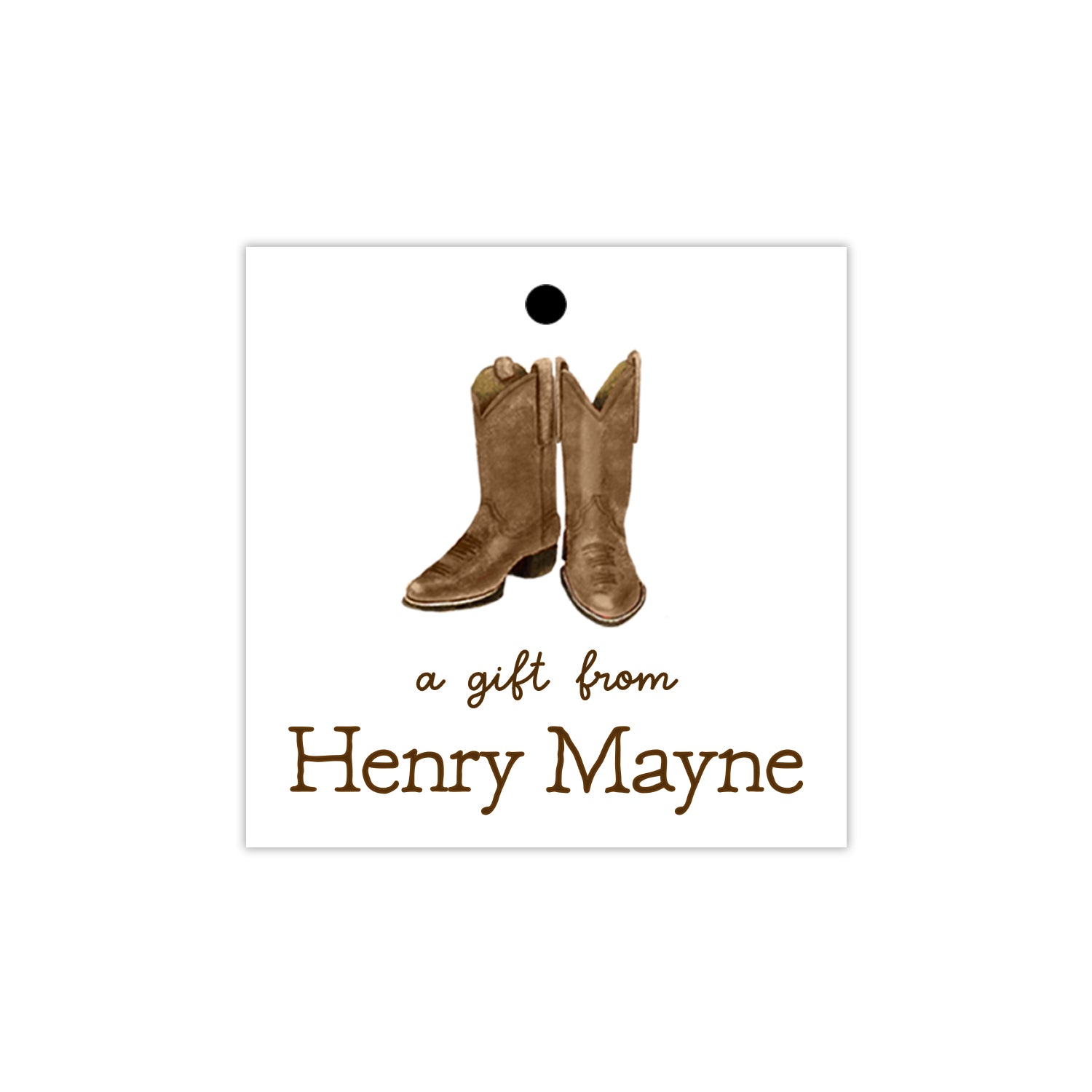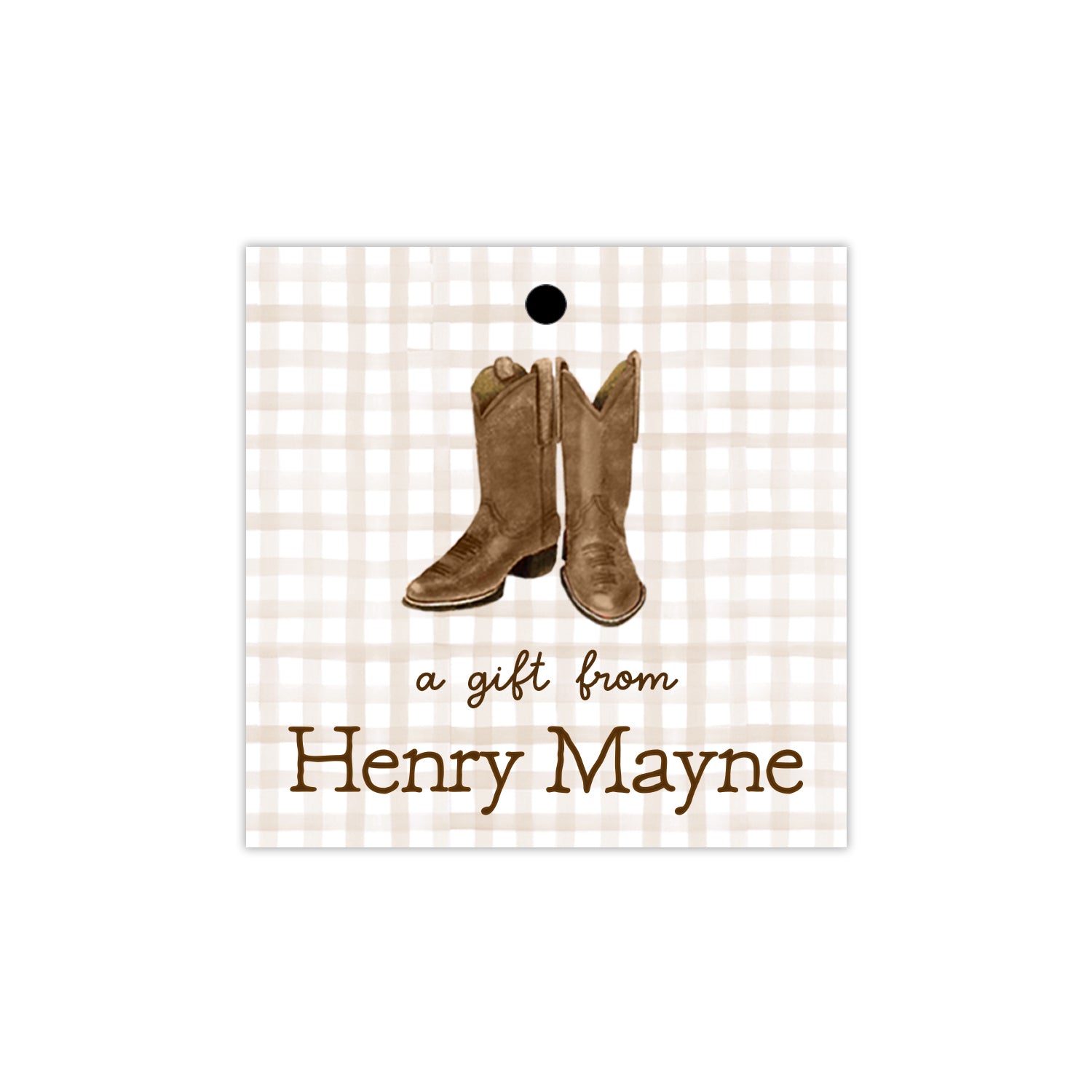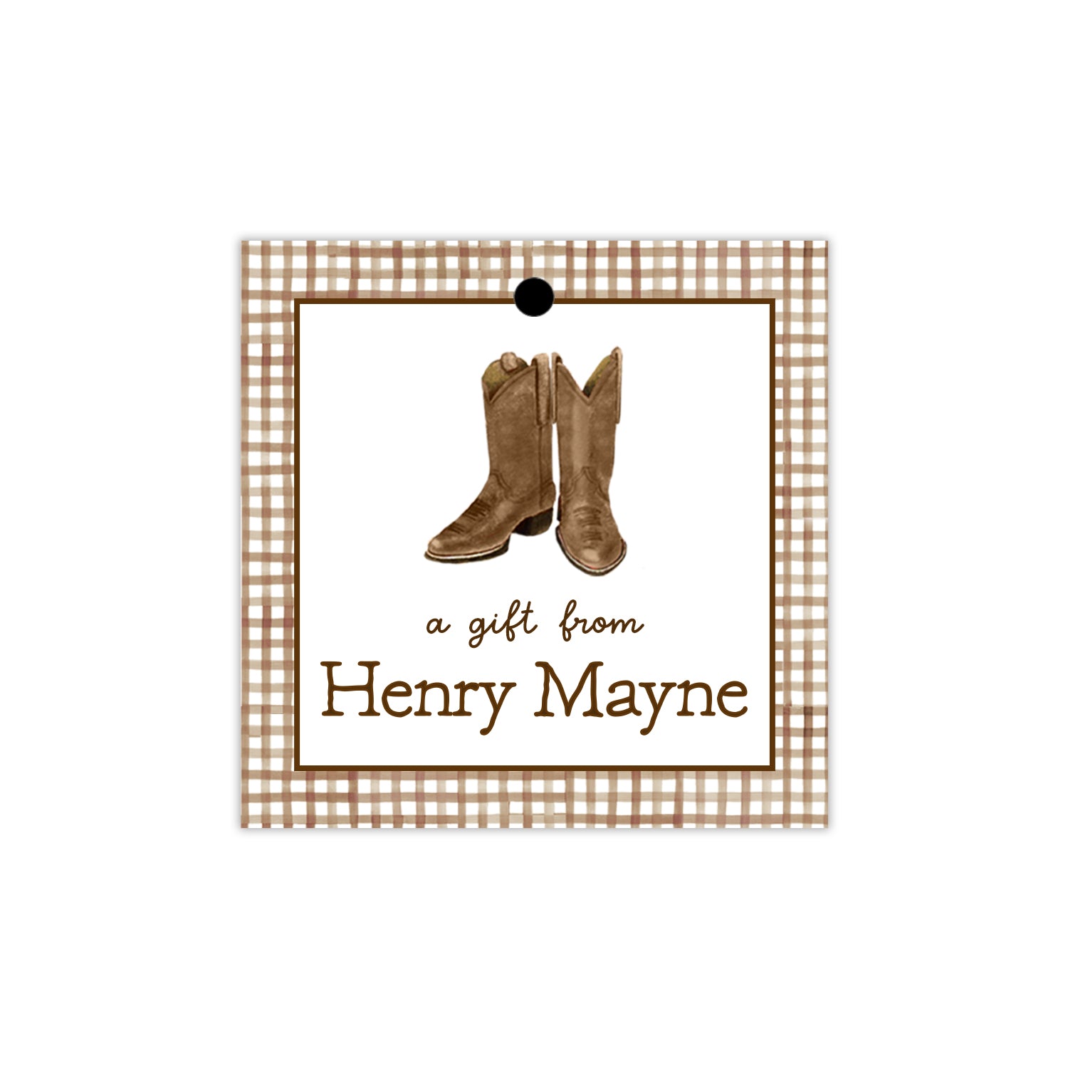 Featuring a hand-painted brown boots and gingham, this personalized children’s gift tag is perfect for birthday parties, teacher appreciation gifts, and more. Comes with a convenient hole punch and string for easy attachment for gifting. Choose from a light brown gingham background, brown gingham border, or solid white background with brown personalization.