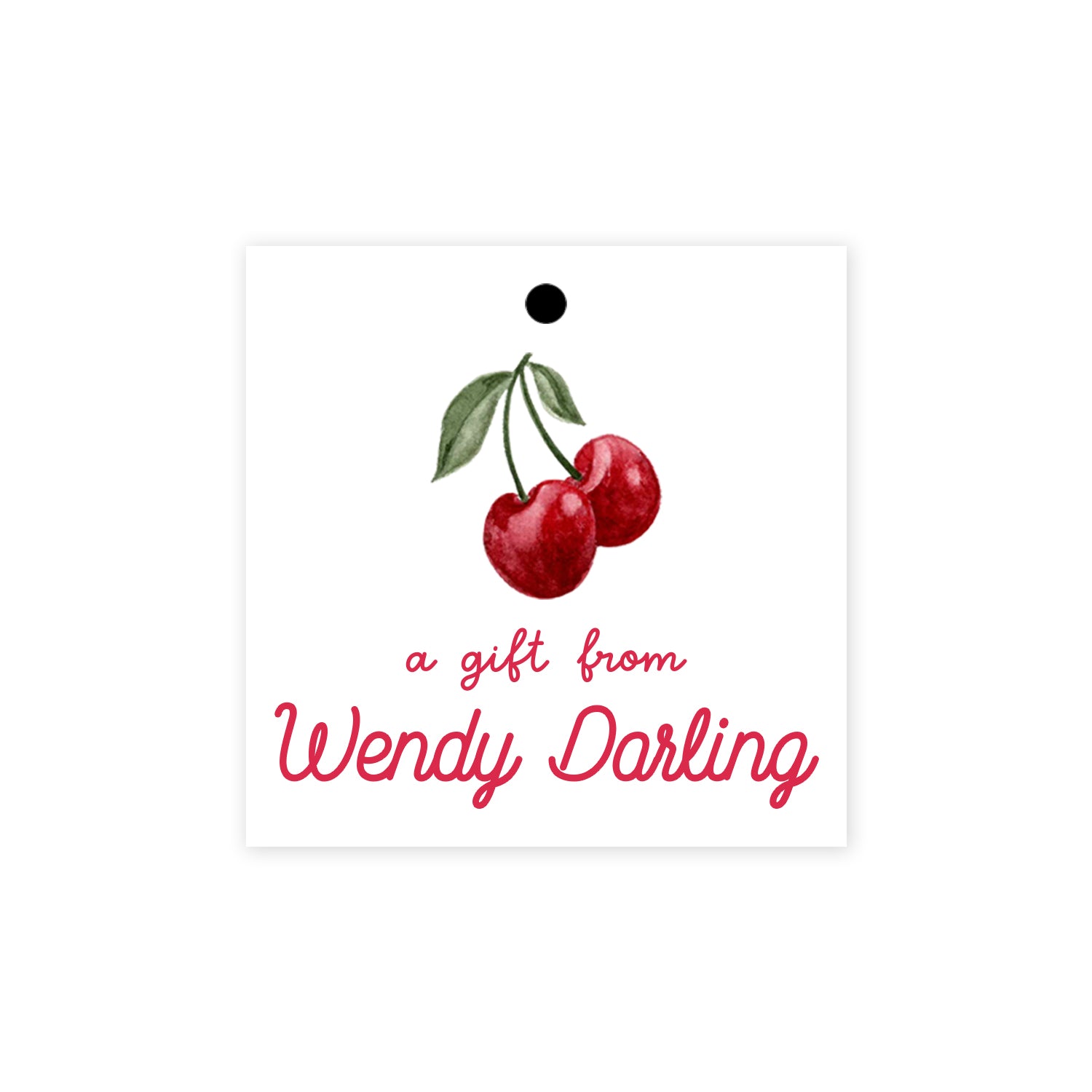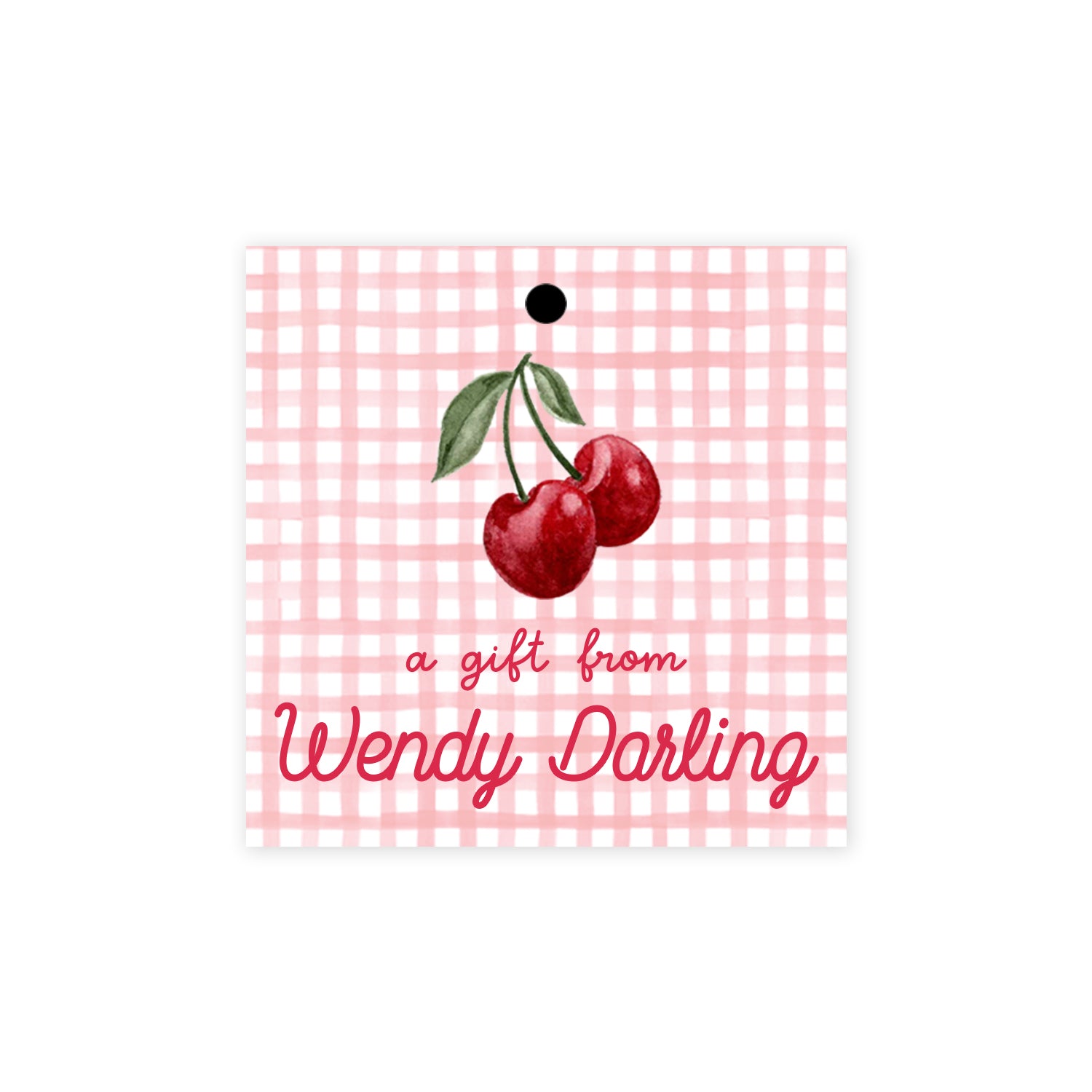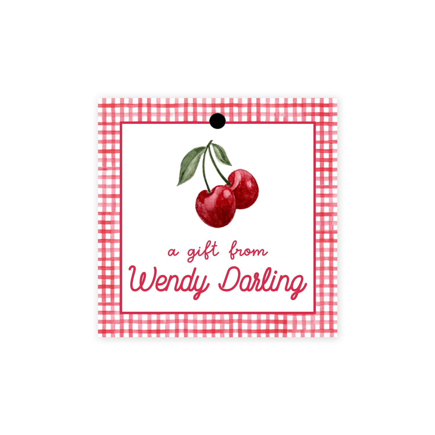 Featuring hand-painted cherries and gingham, this personalized children’s gift tag is perfect for birthday parties, teacher appreciation gifts, and more. Comes with a convenient hole punch and string for easy attachment for gifting. Choose from a pink gingham background, red gingham border, or solid white background with red personalization.