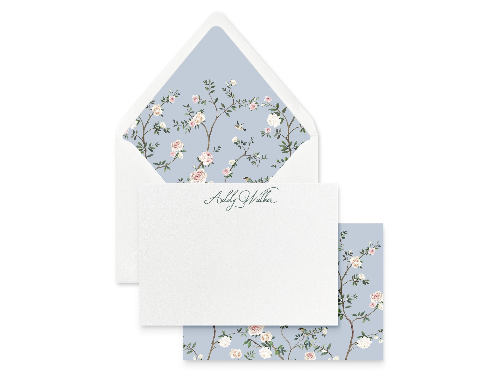 A stationery set made for lovely thoughts. Chinoiserie features Emily Mayne Studio’s signature hand-painted botanical illustrations, delicately arranged on A6 flat note cards with a coordinating back design and a softly lined envelope for a finishing touch. Paired with crisp white euro flap envelopes—this personalized stationery set is perfect for handwritten notes, heartfelt thank-yous, and everyday moments worth putting to paper.