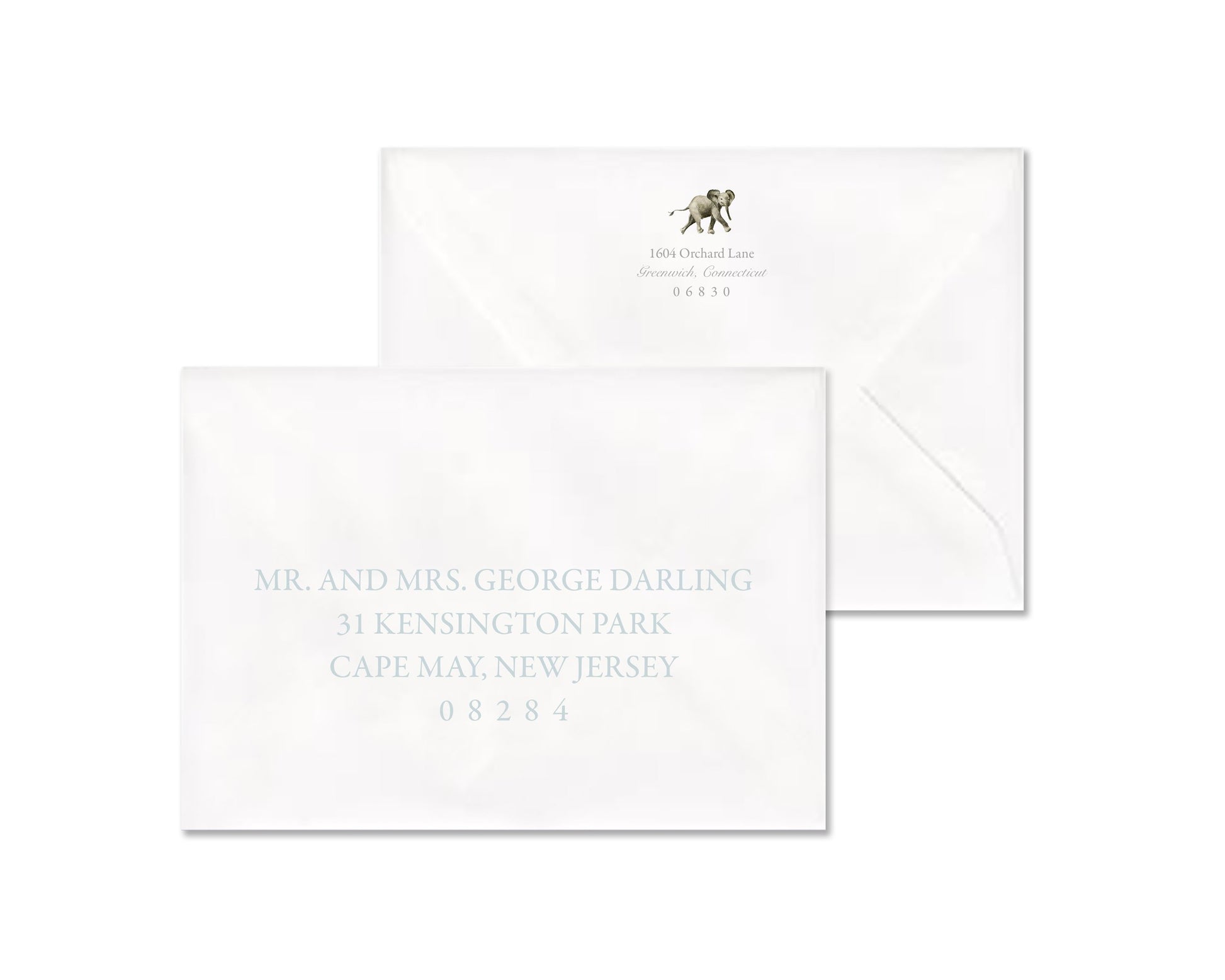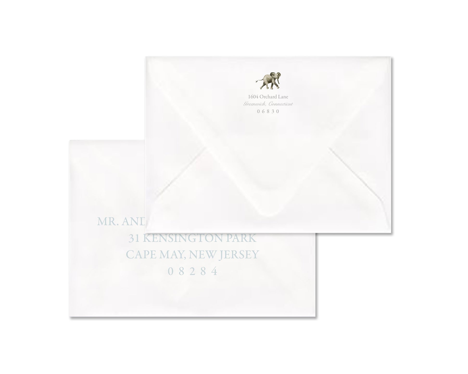Each card comes with free return address printing on back flap of envelope. Want to add recipient address printing to your envelopes? Simply select “Recipient Address Printing”. Once order is confirmed, we will email you formatting instructions for your address printing!