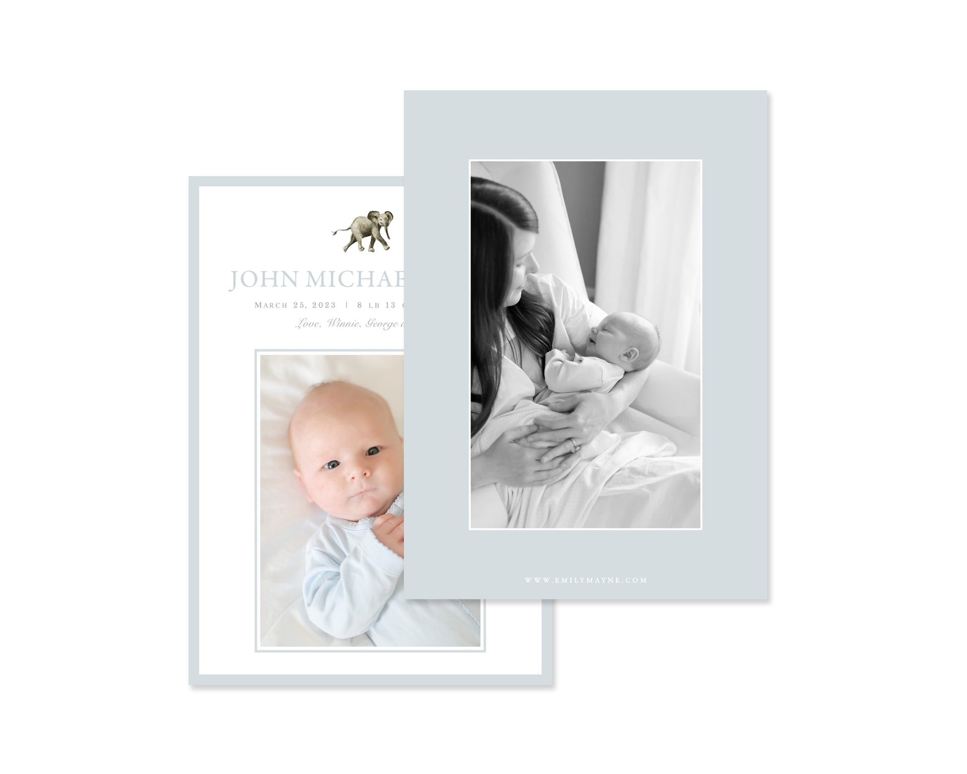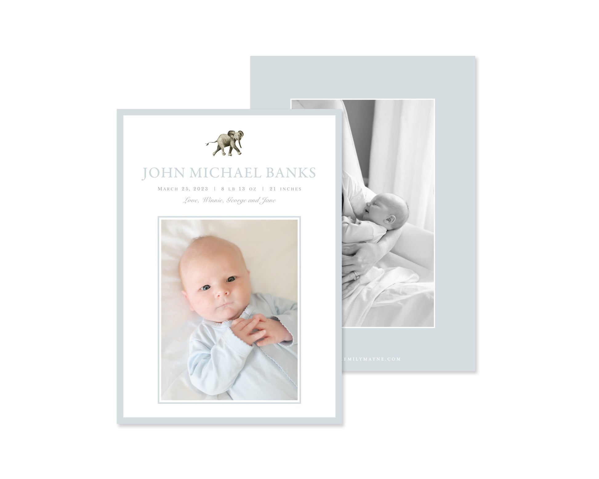 A classic in soft blue. This birth announcement features a hand-illustrated elephant and powder blue trim for a sweet, safari-inspired welcome.