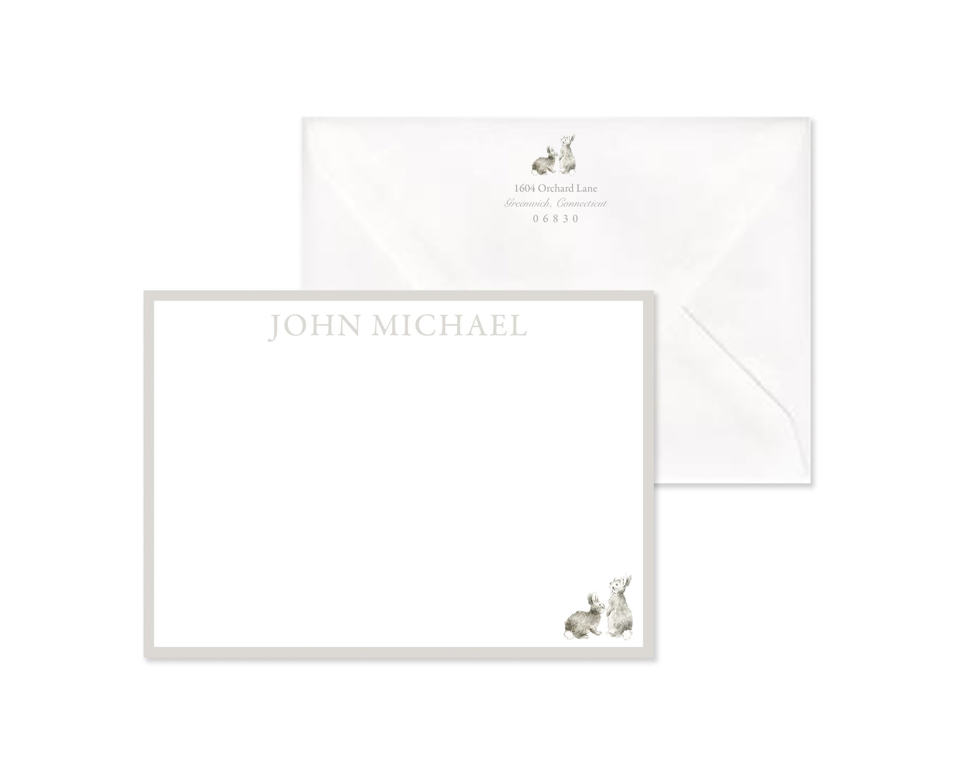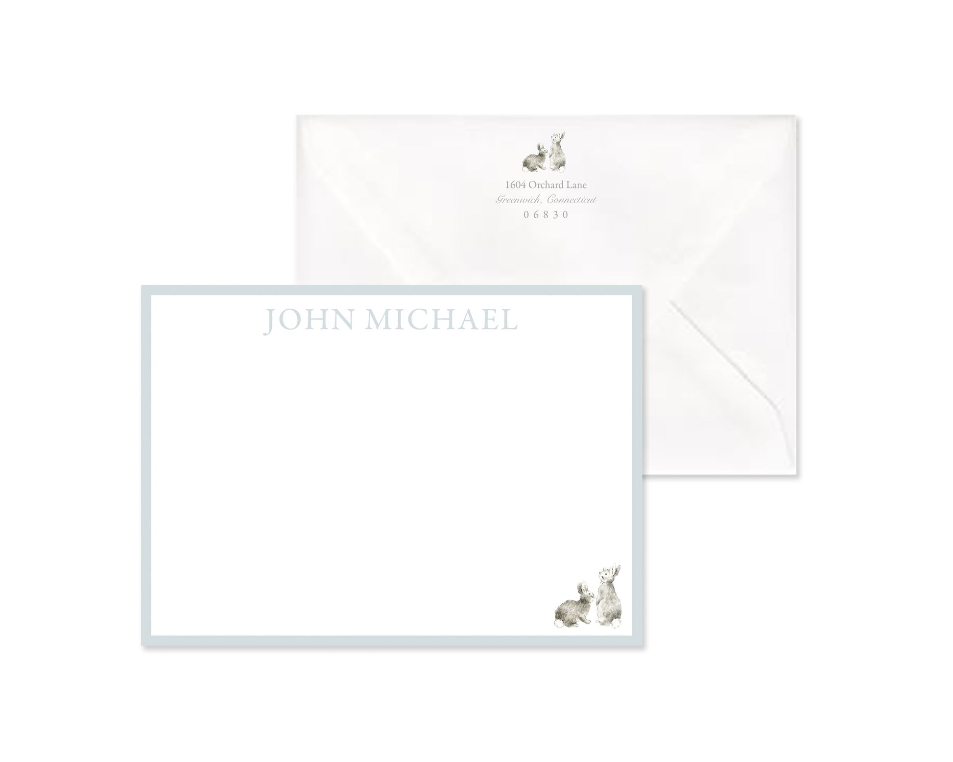 A sweet and timeless design for little ones, this personalized children’s stationery set features a pair of illustrated bunnies nestled in the bottom corner. Choose from pink, blue, or soft grey accents to match your child’s personal style. Matching envelopes include a coordinating bunny motif and return address detail.
