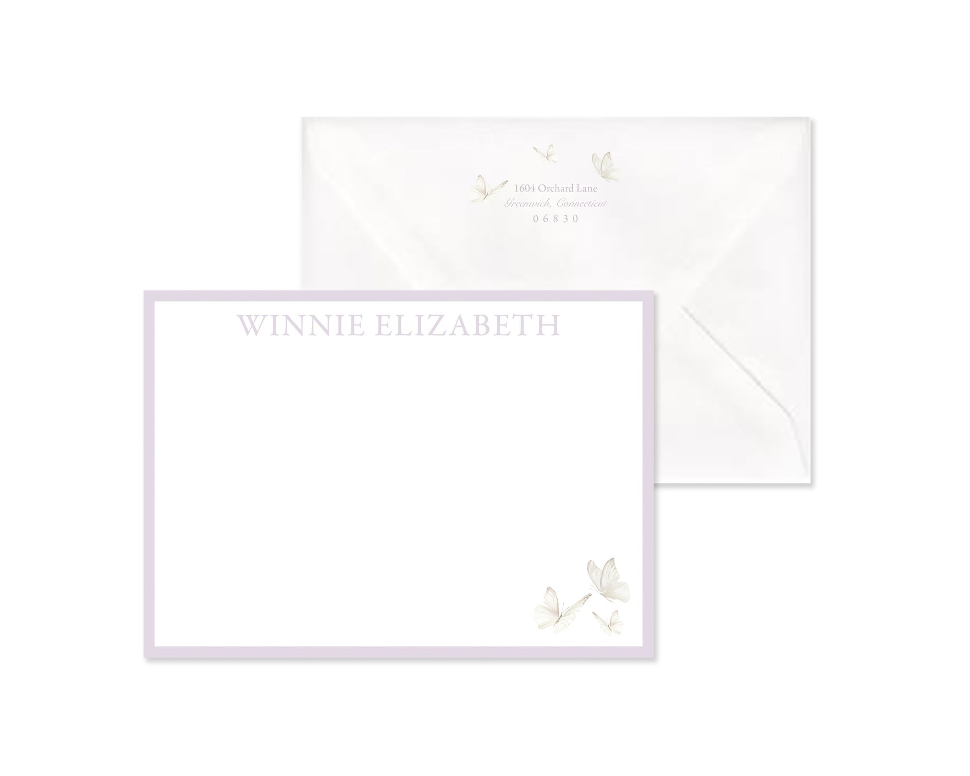 A sweet and delicate touch for your little one’s notes, this personalized children’s stationery set features soft watercolor butterflies in your choice of lavender, pink, or green. Matching envelopes include a coordinating butterfly motif and return address, making this set just right for thank-yous and everyday correspondence.