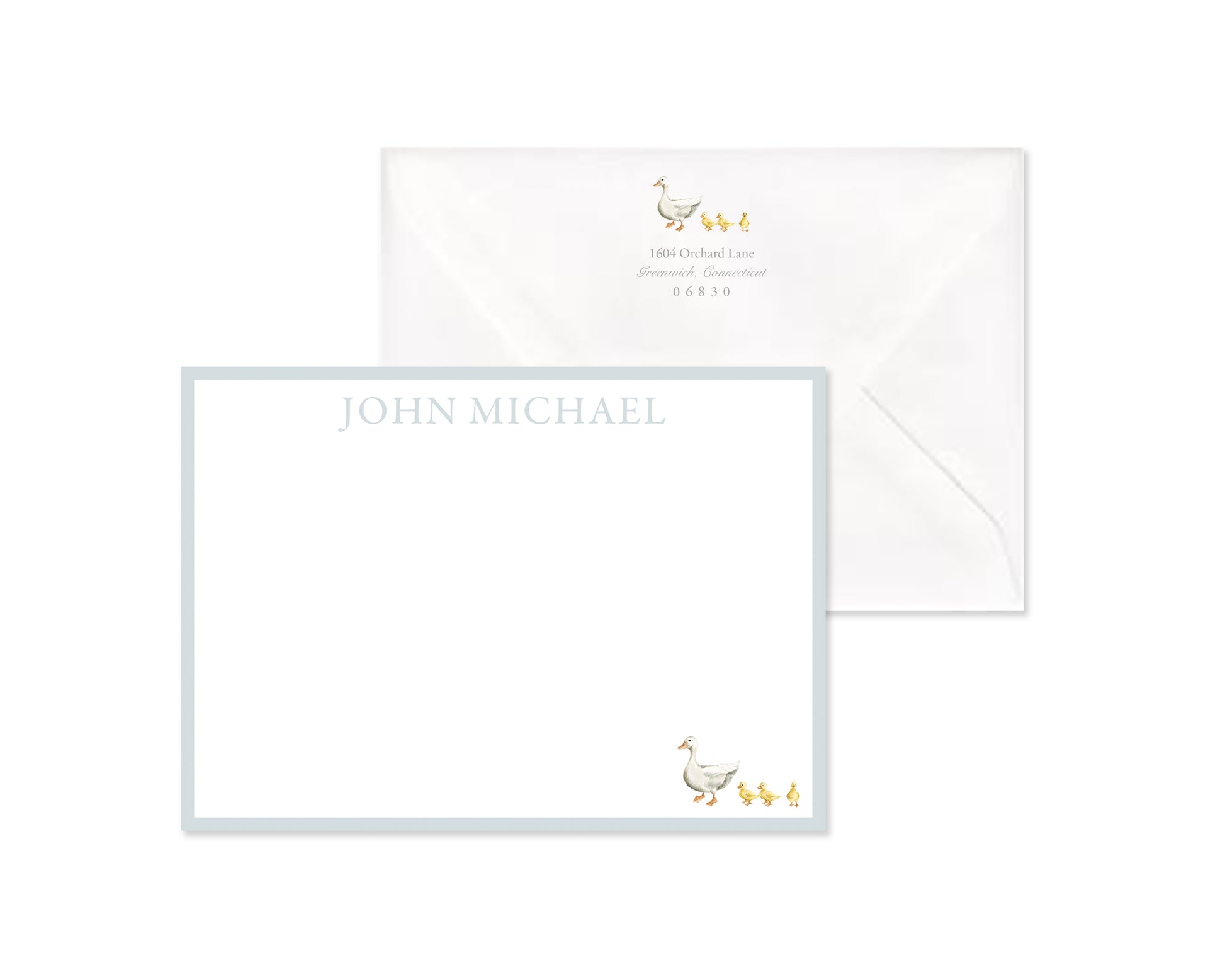 A sweet nod to timeless woodland charm, this personalized children’s stationery set features a pair of hand-illustrated ducklings nestled in the corner. Available with a yellow, blue, or pink border, each card is a charming way for little ones to send their warmest thanks. Matching envelopes include the coordinating bunny artwork and return address.