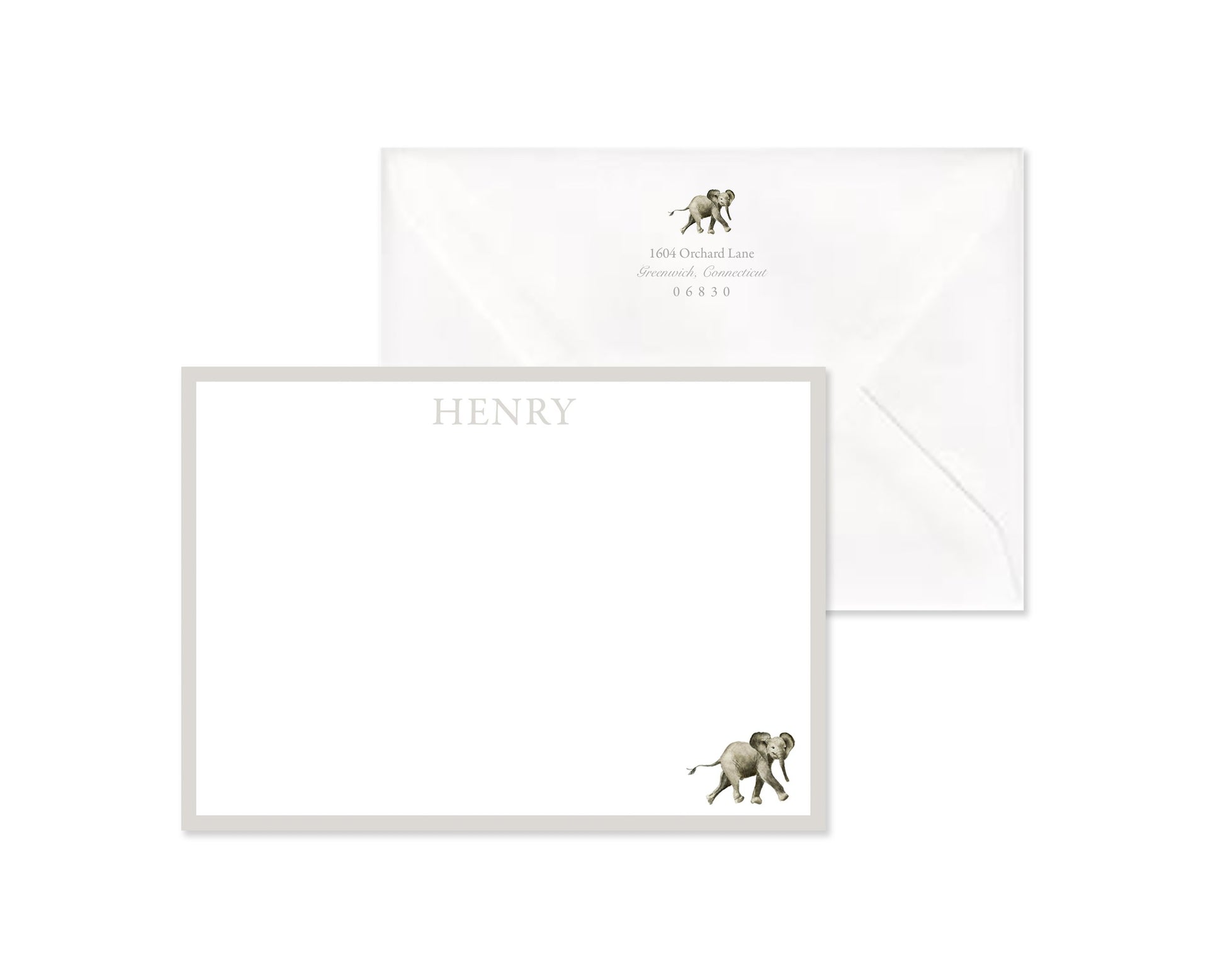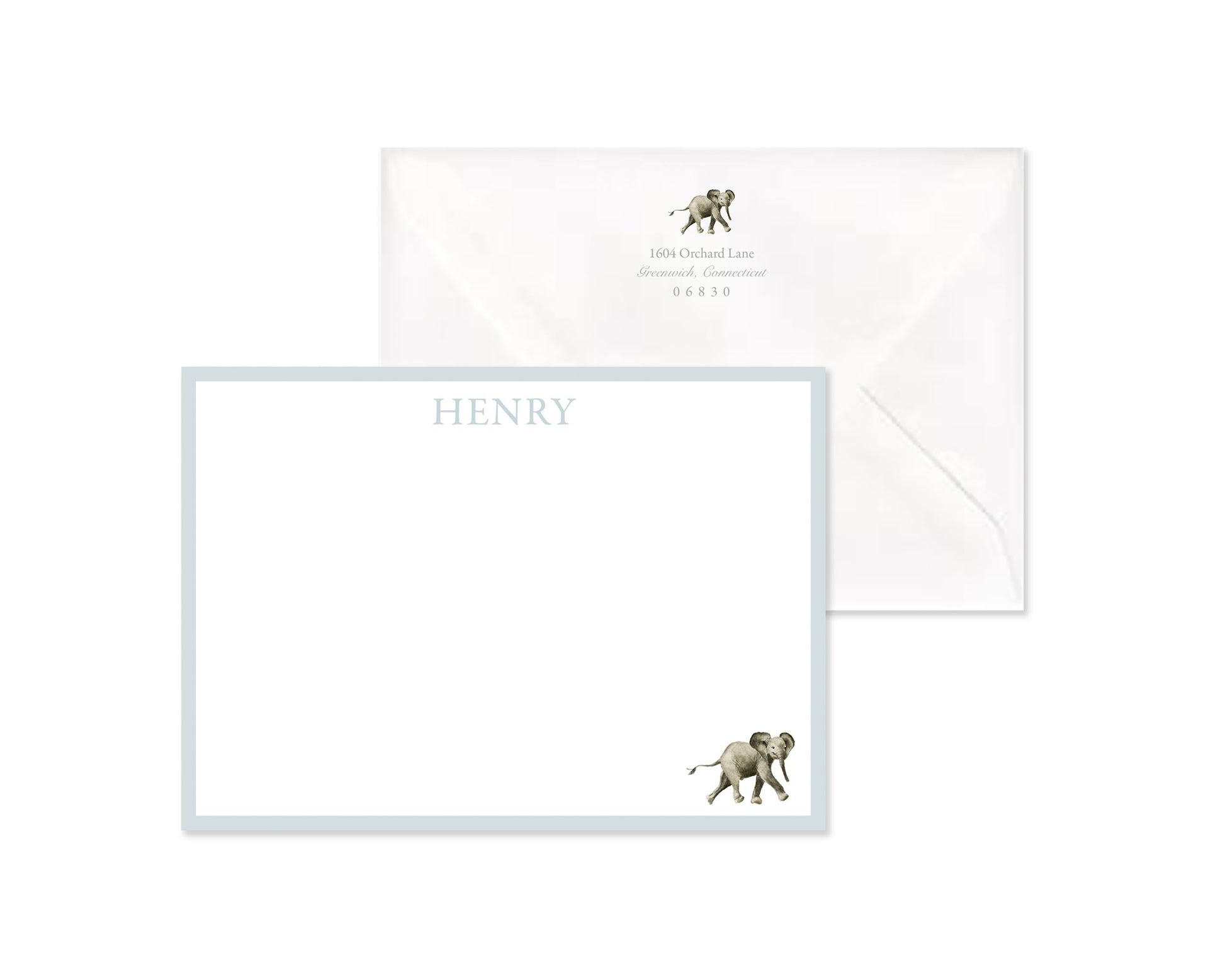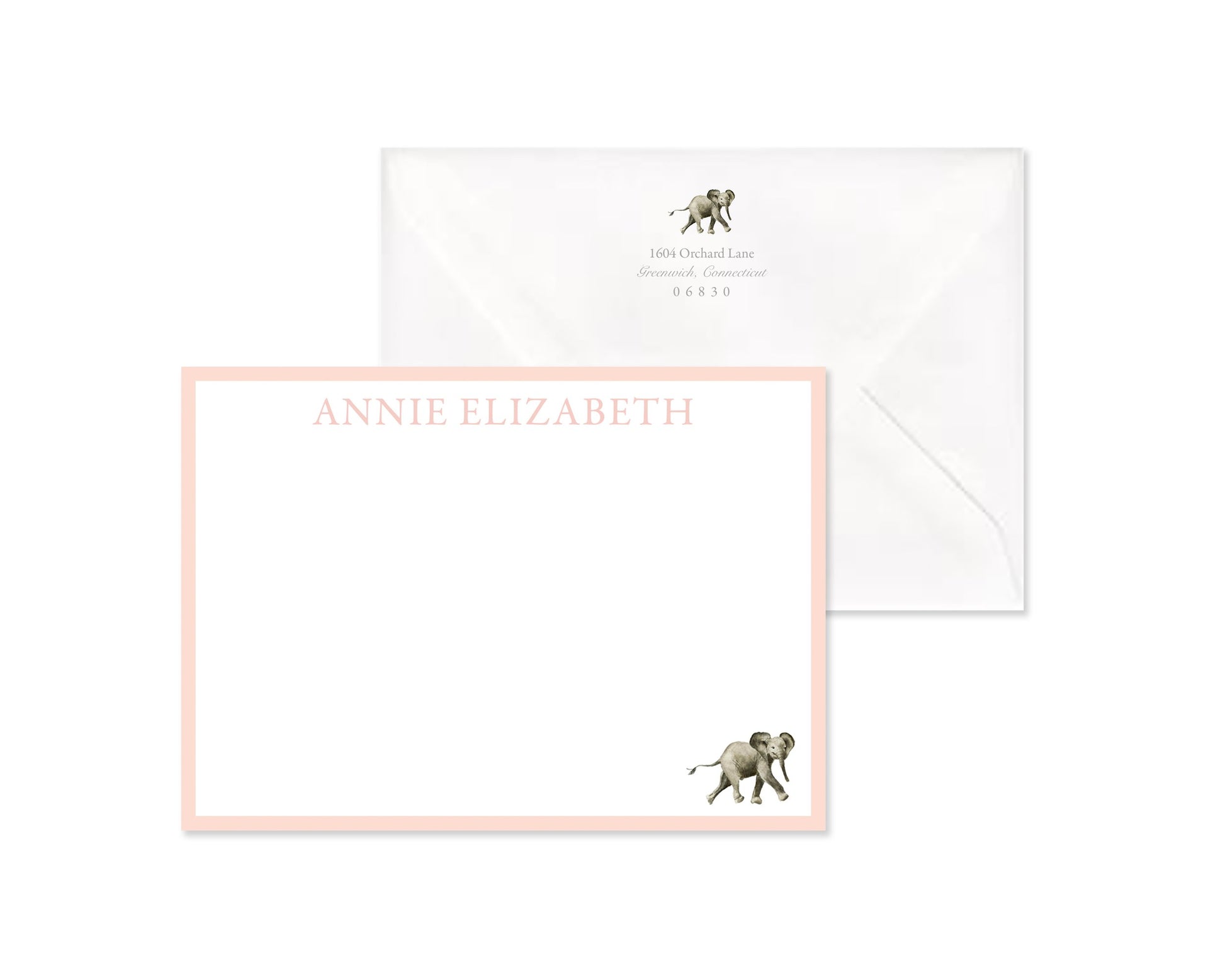 A gentle nod to the animal kingdom, this personalized children’s stationery set features a playful baby elephant in your choice of pink, grey, or blue. Perfect for thank-yous, notes, and everyday correspondence, these cards add charm to any child’s message. Matching envelopes include the same elephant artwork and a coordinating return address.