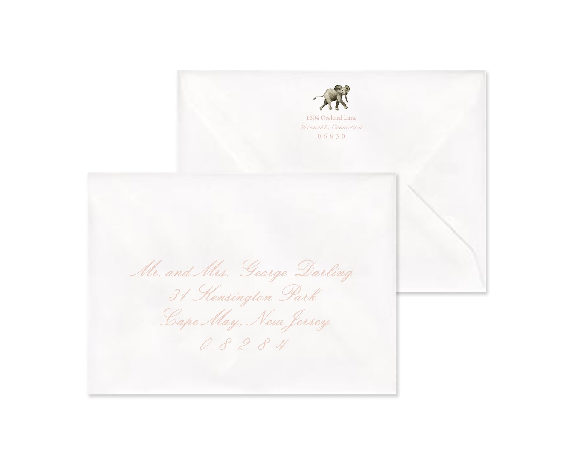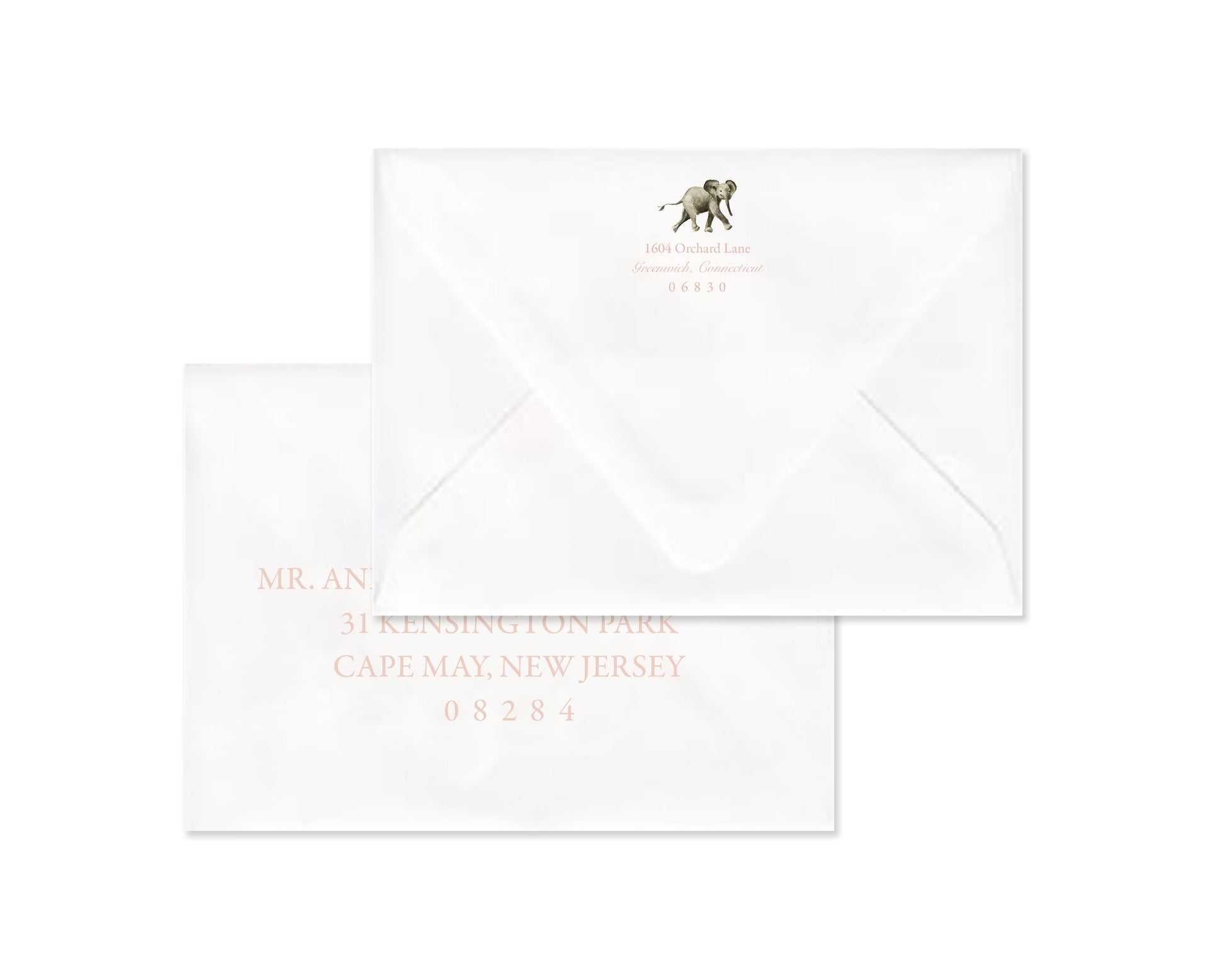 Each card comes with free return address printing on back flap of envelope. Want to add recipient address printing to your envelopes? Simply select “Recipient Address Printing”. Once order is confirmed, we will email you formatting instructions for your address printing!