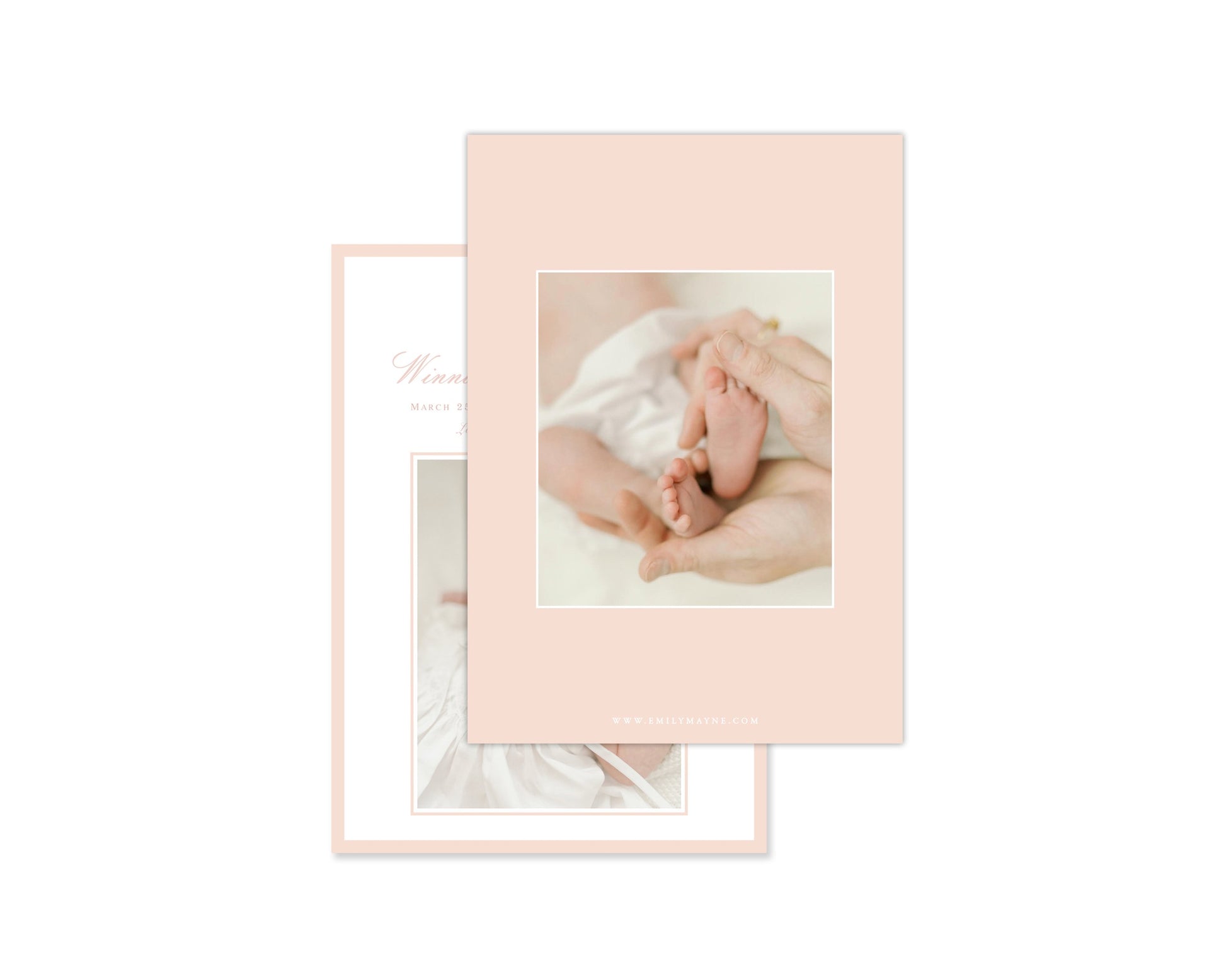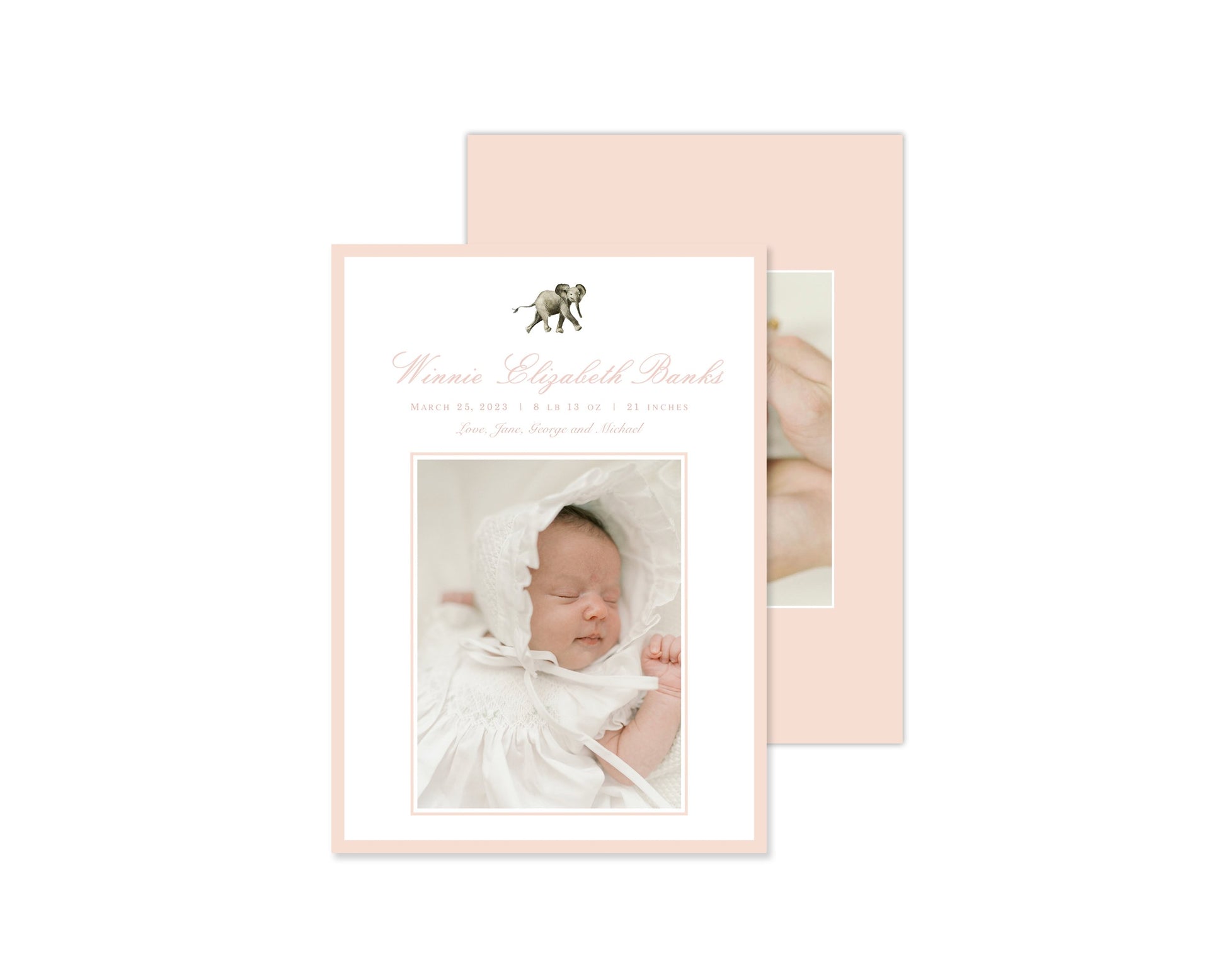 A gentle welcome in blush tones. This announcement features a hand-illustrated elephant and soft pink border for a sweet, storybook-inspired debut.