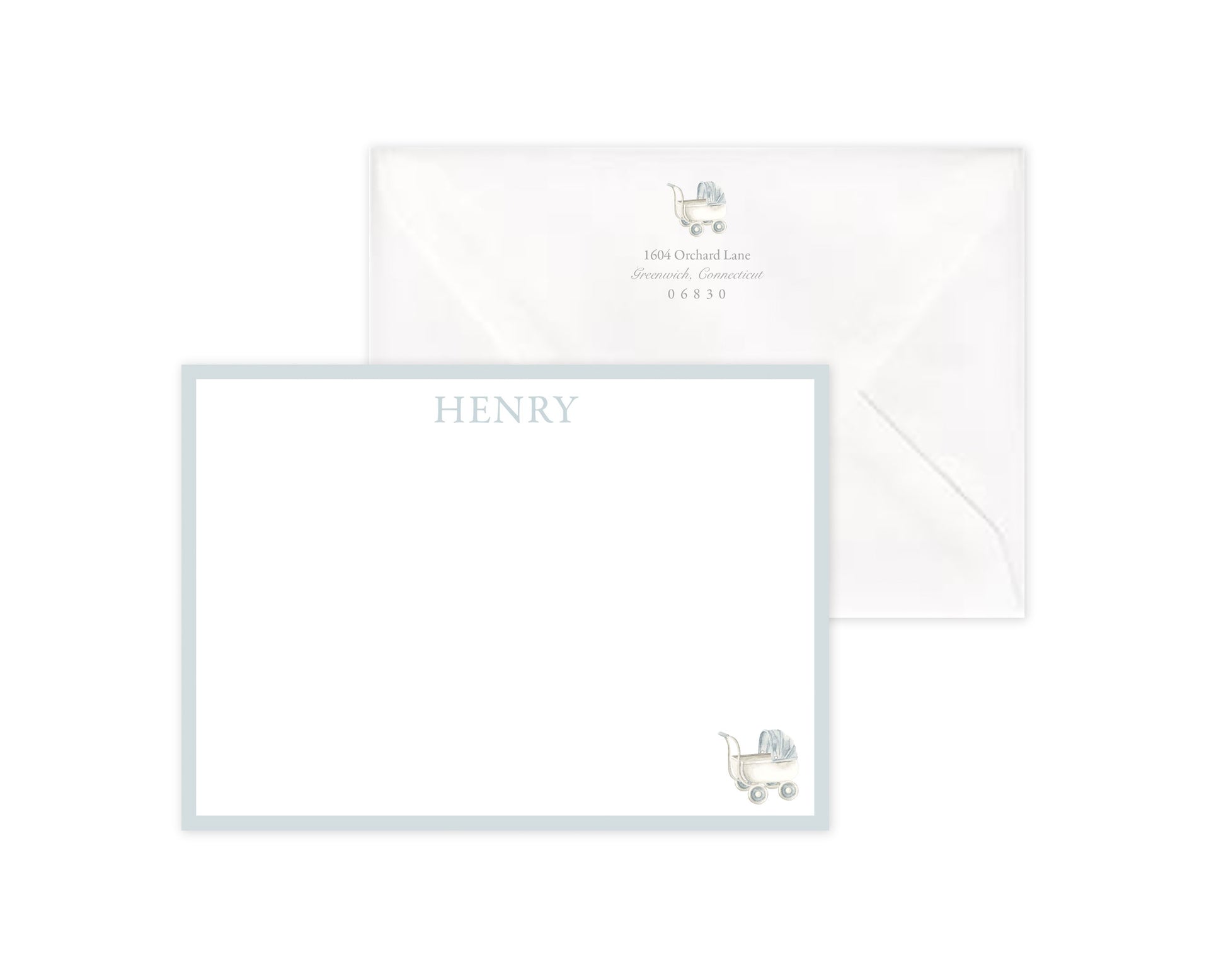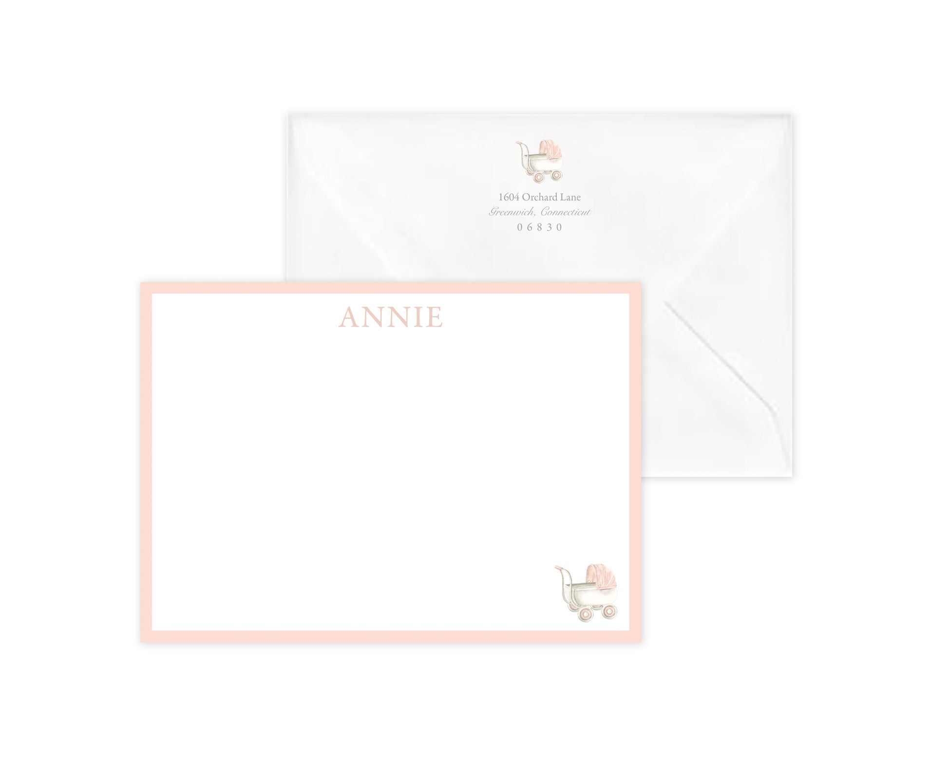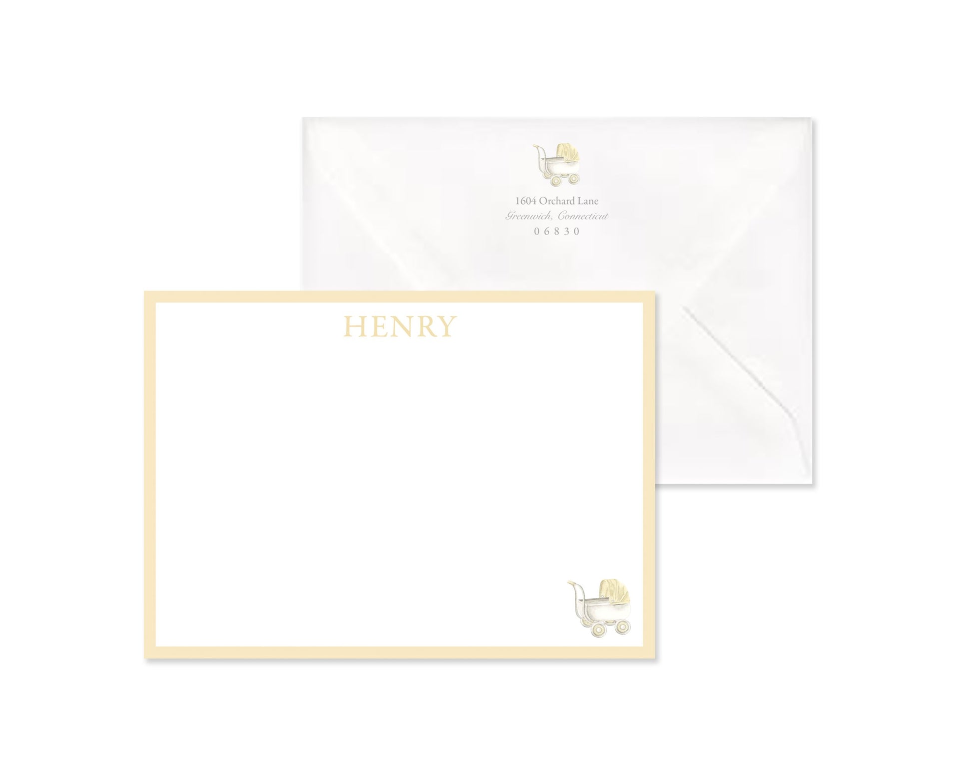 With vintage pram artwork and soft pastel hues, this personalized children’s stationery set evokes the sweetness of babyhood. Choose from pink, blue, or yellow border options, all with matching envelopes to complete the set.