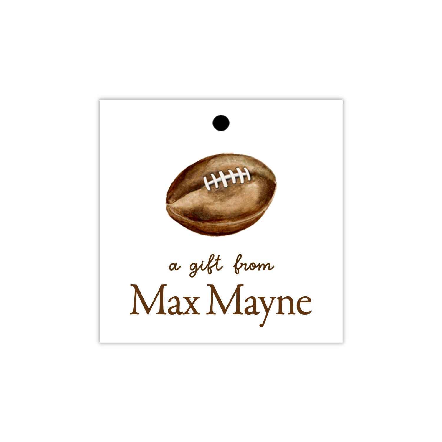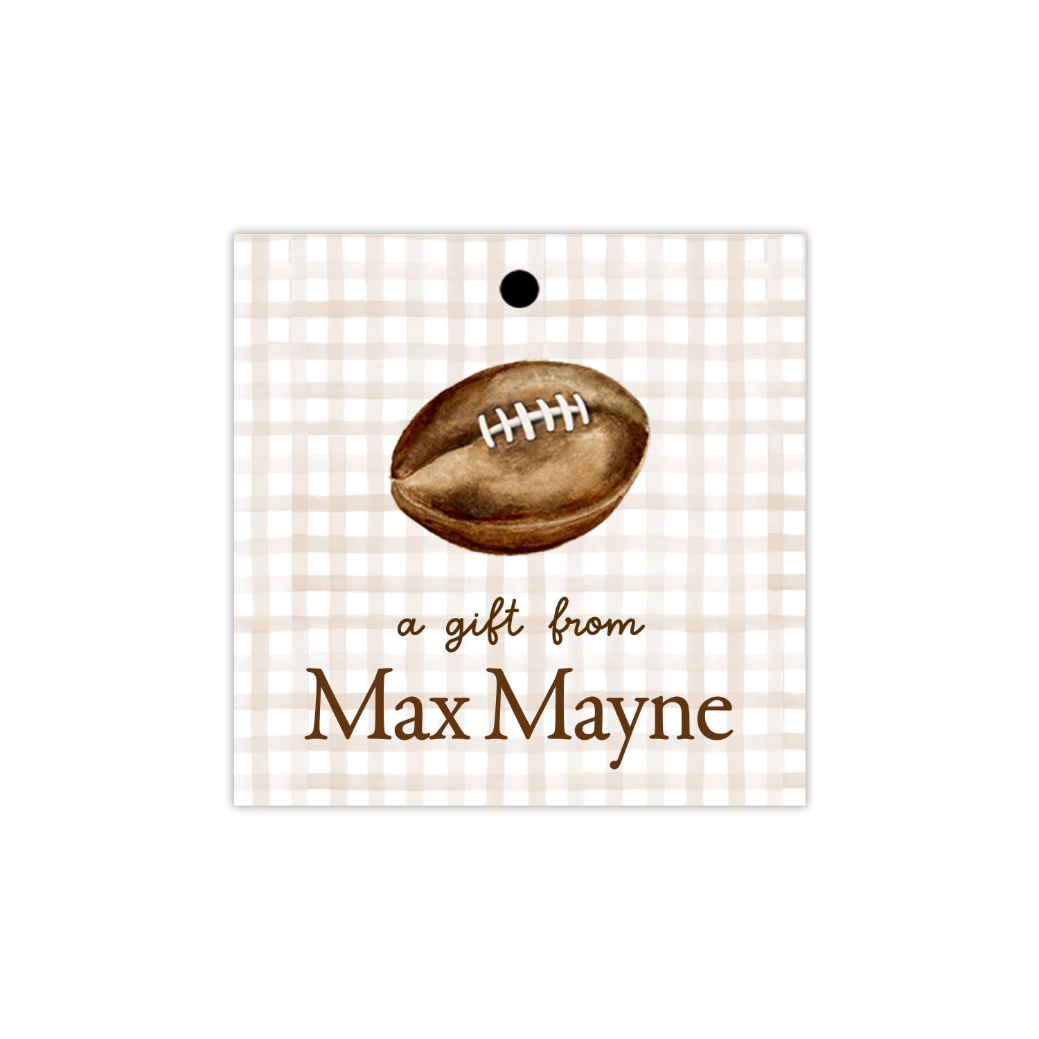 Featuring a hand-painted football and gingham, this personalized children’s gift tag is perfect for birthday parties, teacher appreciation gifts, and more. Comes with a convenient hole punch and string for easy attachment for gifting. Choose from a light brown gingham background, brown gingham border, or solid white background with brown personalization.