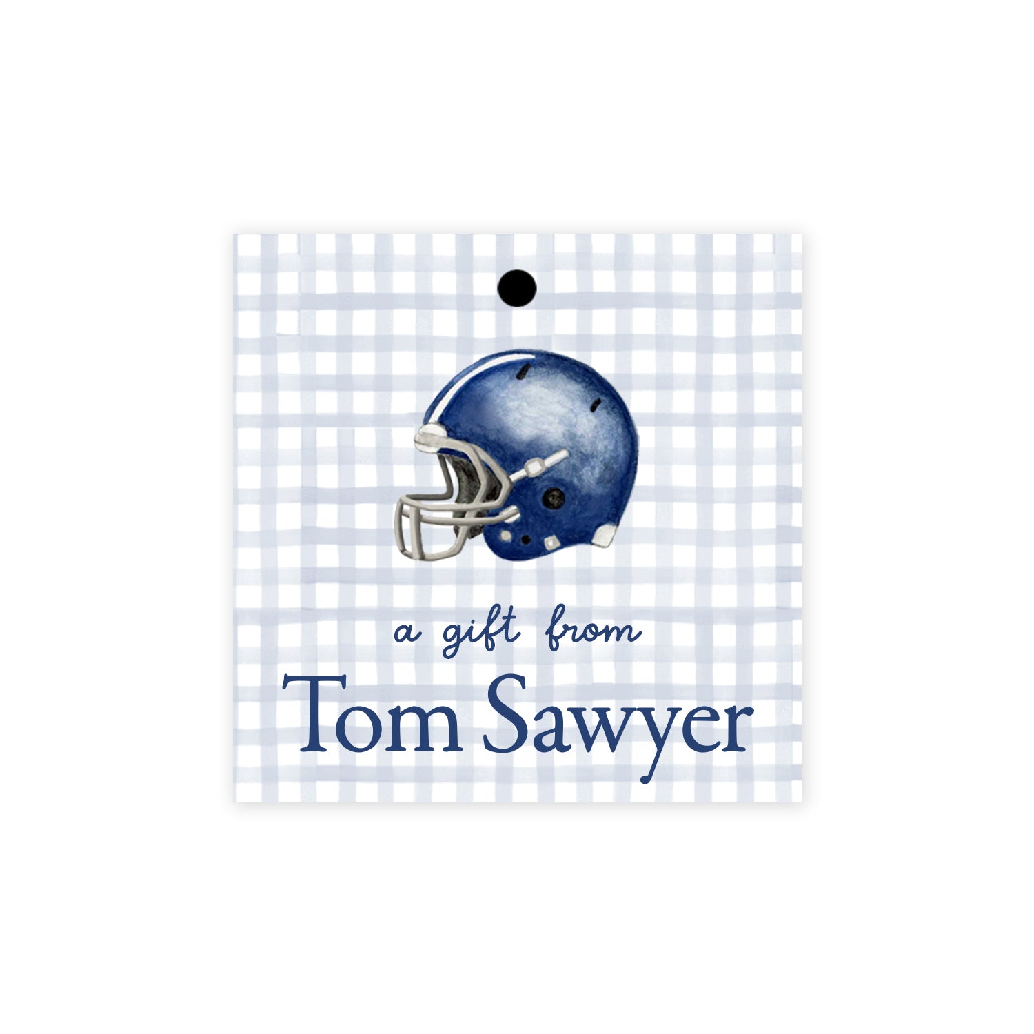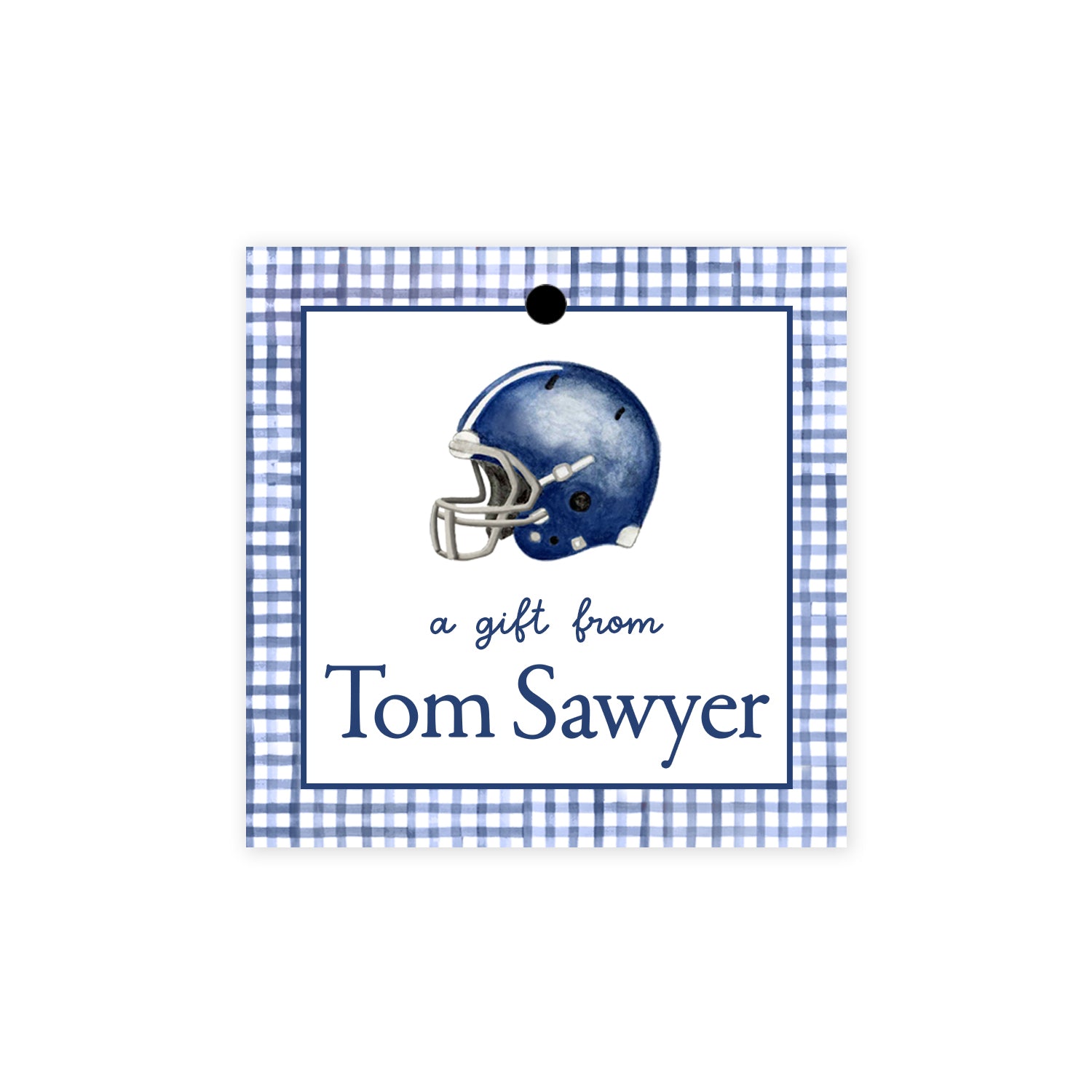 Featuring a hand-painted football helmet and gingham, this personalized children’s gift tag is perfect for birthday parties, teacher appreciation gifts, and more. Comes with a convenient hole punch and string for easy attachment for gifting. Choose from a light navy gingham background, navy gingham border, or solid white background with navy personalization.