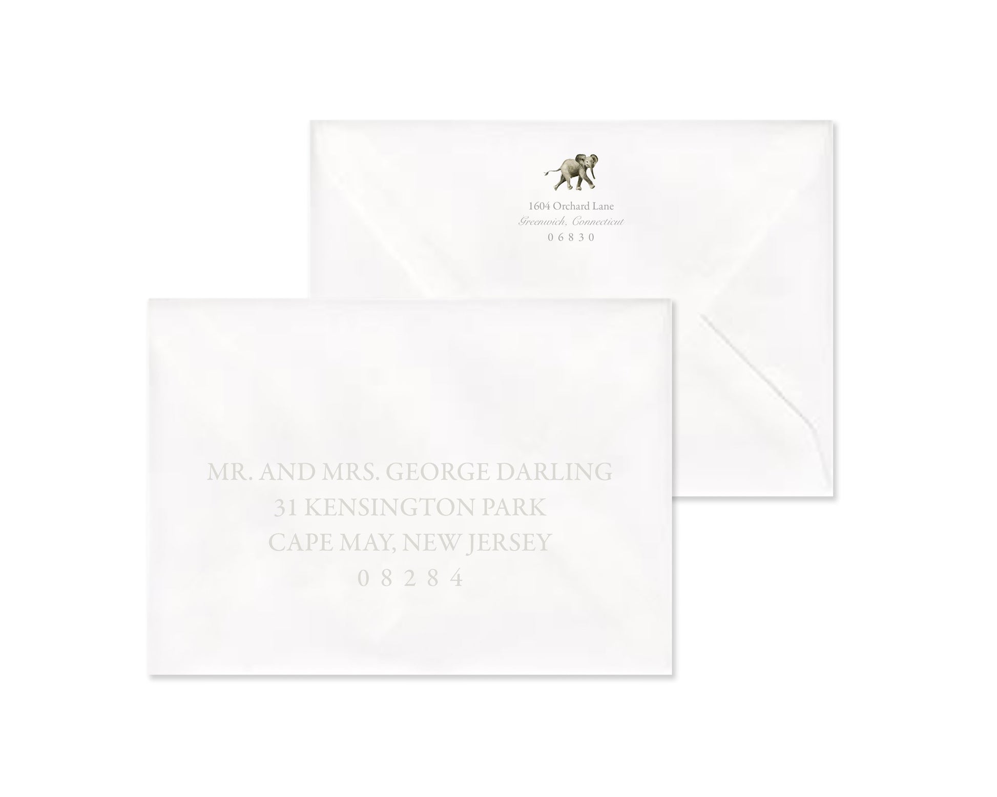 Each card comes with free return address printing on back flap of envelope. Want to add recipient address printing to your envelopes? Simply select “Recipient Address Printing”. Once order is confirmed, we will email you formatting instructions for your address printing!