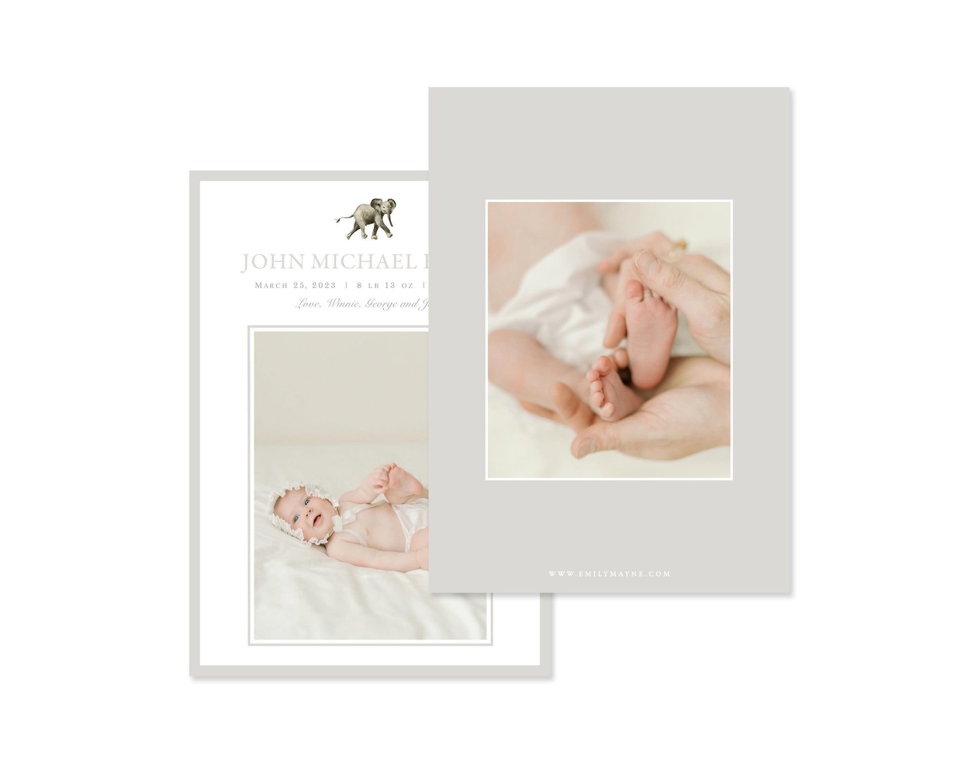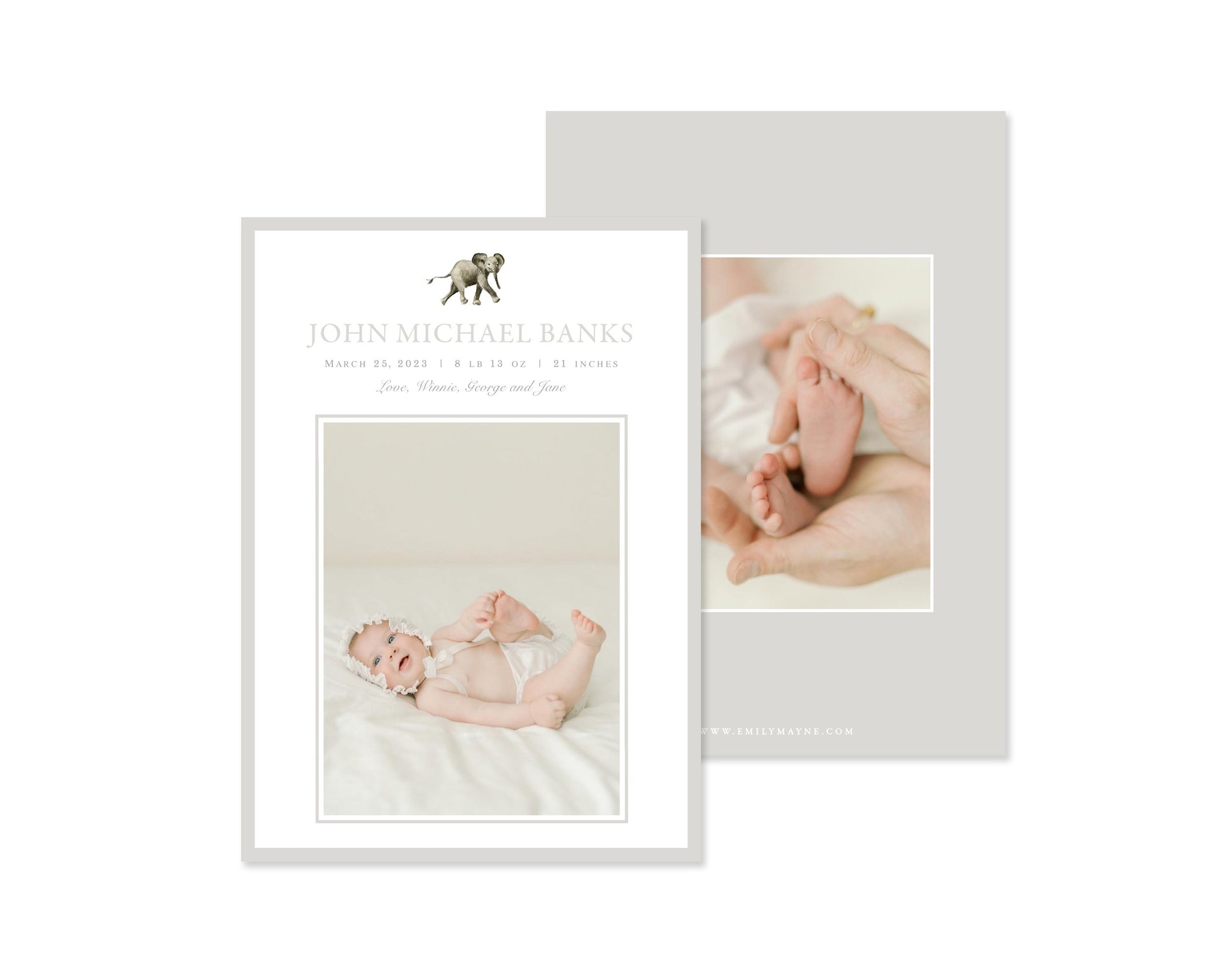 A soft and timeless debut. This birth announcement features a hand-illustrated elephant and warm neutral tones for a classic, animal-inspired welcome.