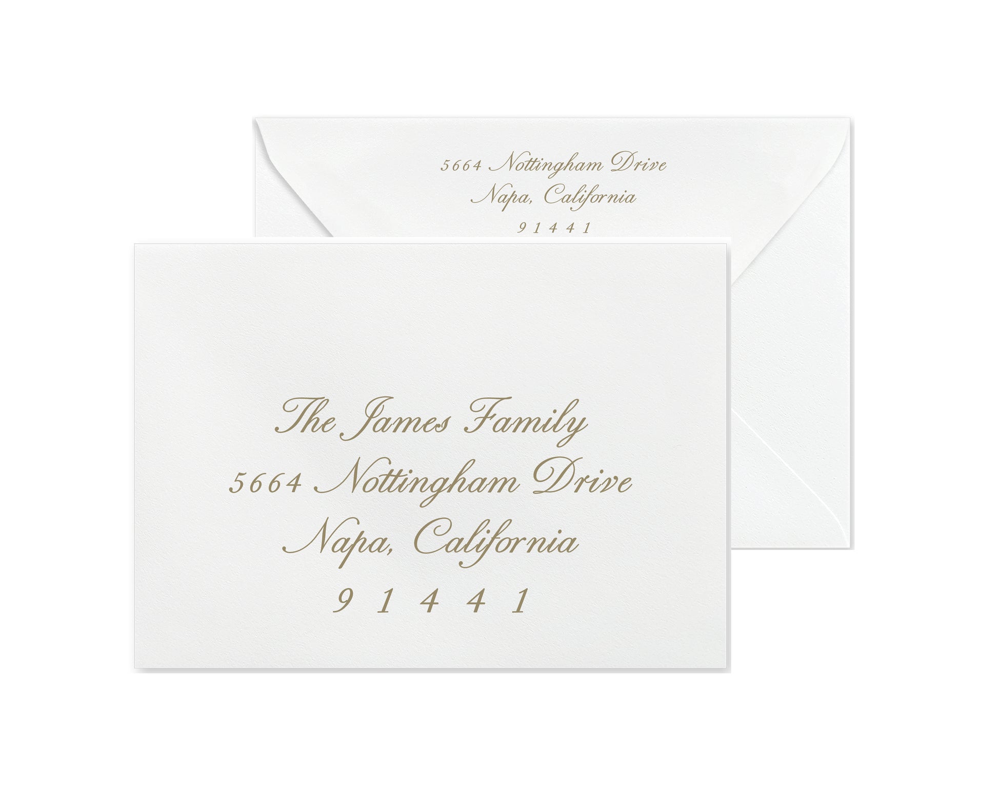 Each card comes with free return address printing on back flap of envelope. Want to add recipient address printing to your envelopes? Simply select “Recipient Address Printing”. Once order is confirmed, we will email you formatting instructions for your address printing!
