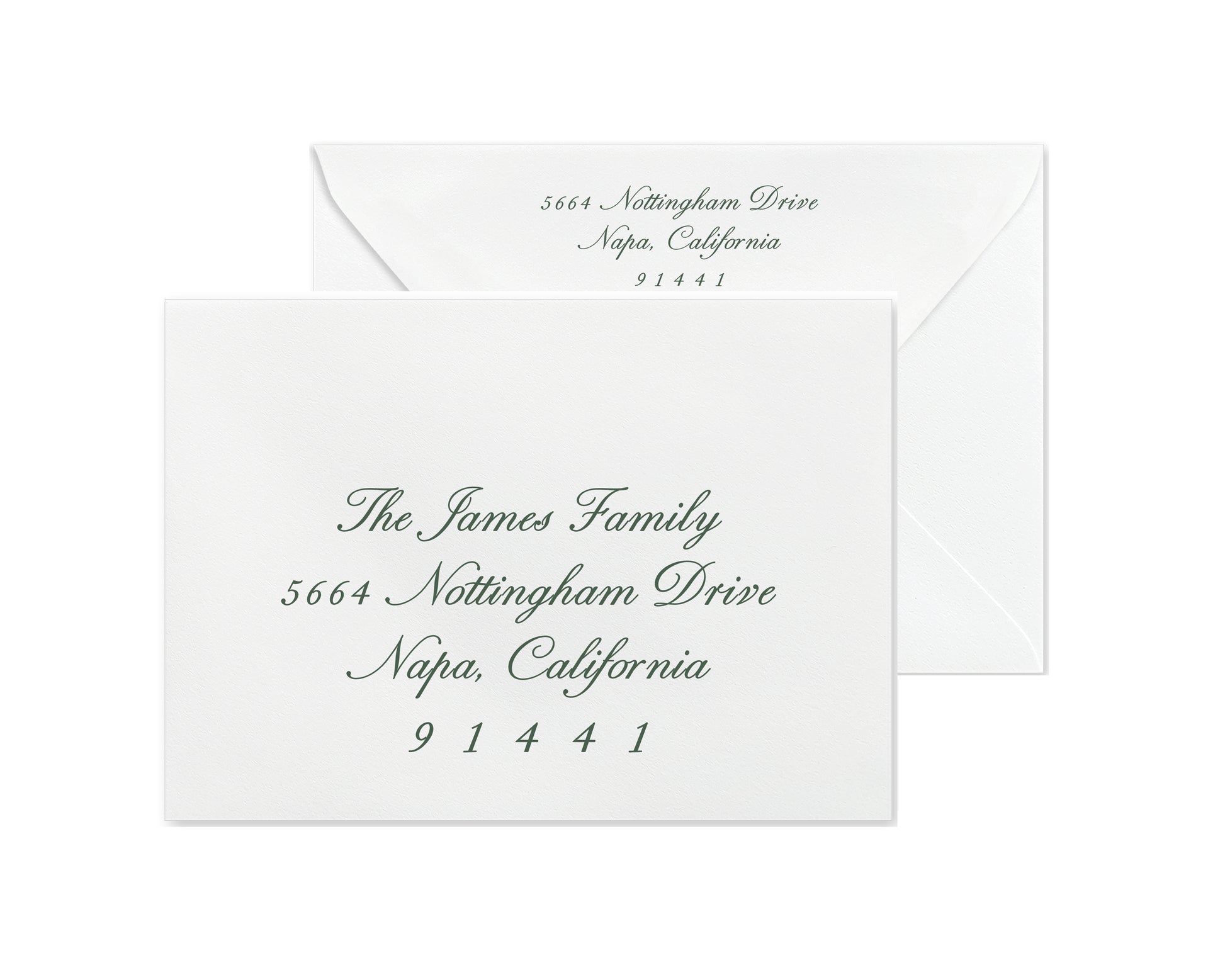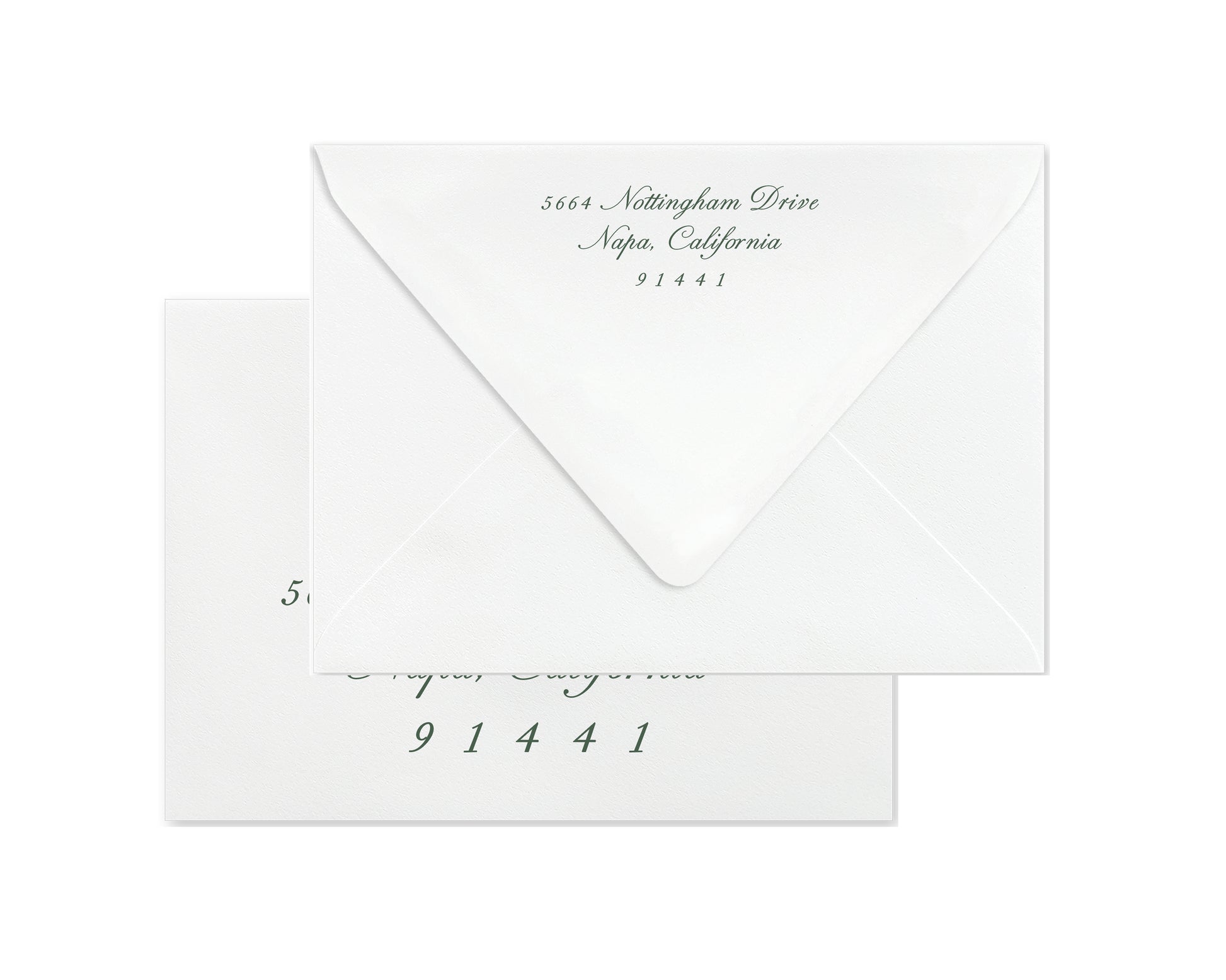 Each card comes with free return address printing on back flap of envelope. Want to add recipient address printing to your envelopes? Simply select “Recipient Address Printing”. Once order is confirmed, we will email you formatting instructions for your address printing!