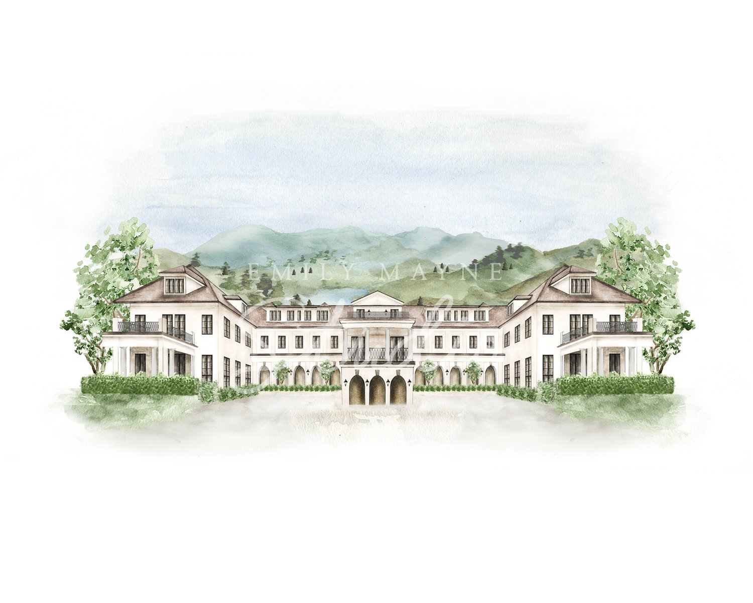 Commemorate your wedding with a hand-painted watercolor rendering of your venue by Emily Mayne. Choose from our library and keepsake or gift it as a large scale print, or even download it as a digital file to use for your own wedding paper good needs.
