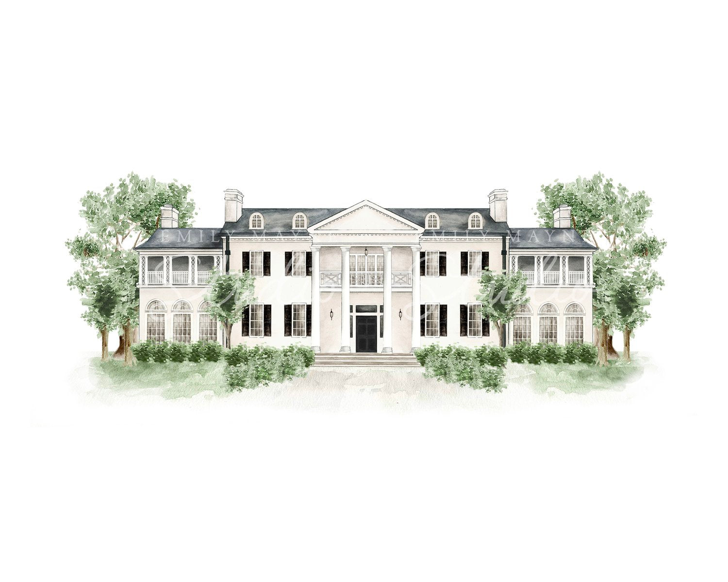 Commemorate your wedding with a hand-painted watercolor rendering of your venue by Emily Mayne. Choose from our library and keepsake or gift it as a large scale print, or even download it as a digital file to use for your own wedding paper good needs.