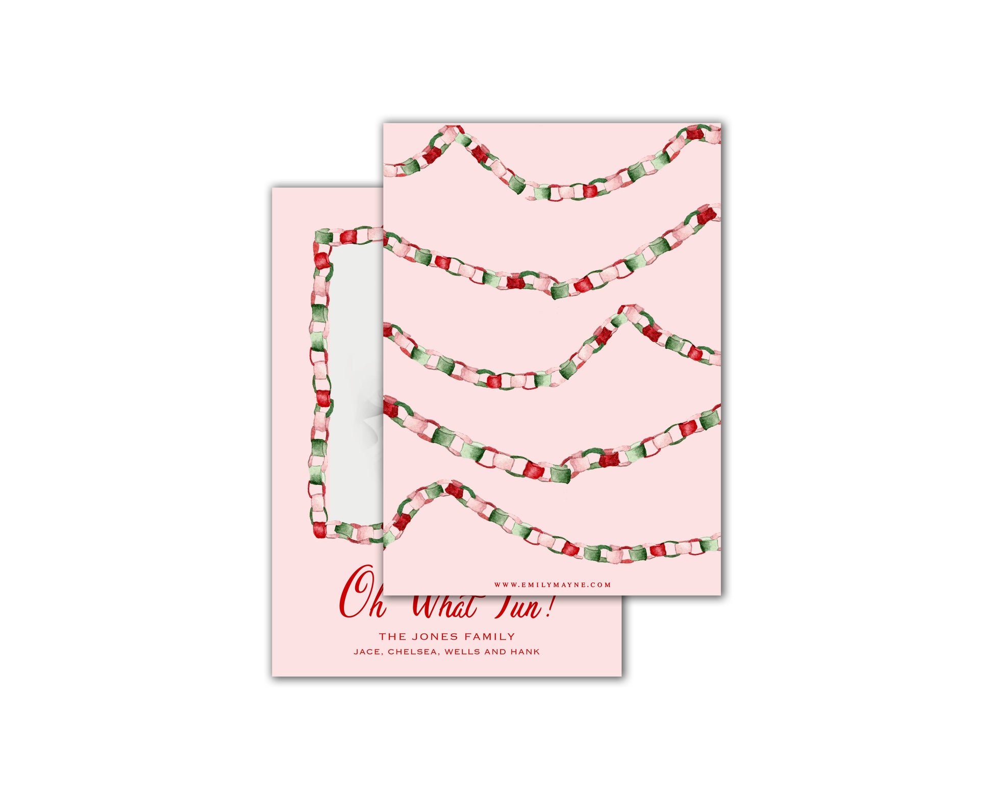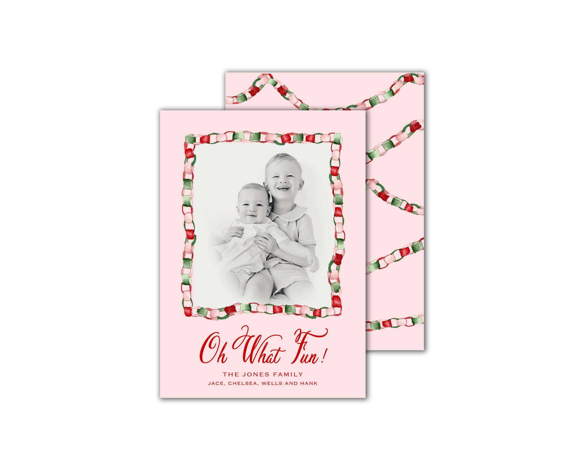 Bring a touch of playful nostalgia to your holiday greetings with our paper chain Christmas cards. Inspired by the classic handmade garlands of childhood, this design frames your family photo with festive hand-painted chains. Share your holiday spirit in a cheerful way to celebrate the season!
