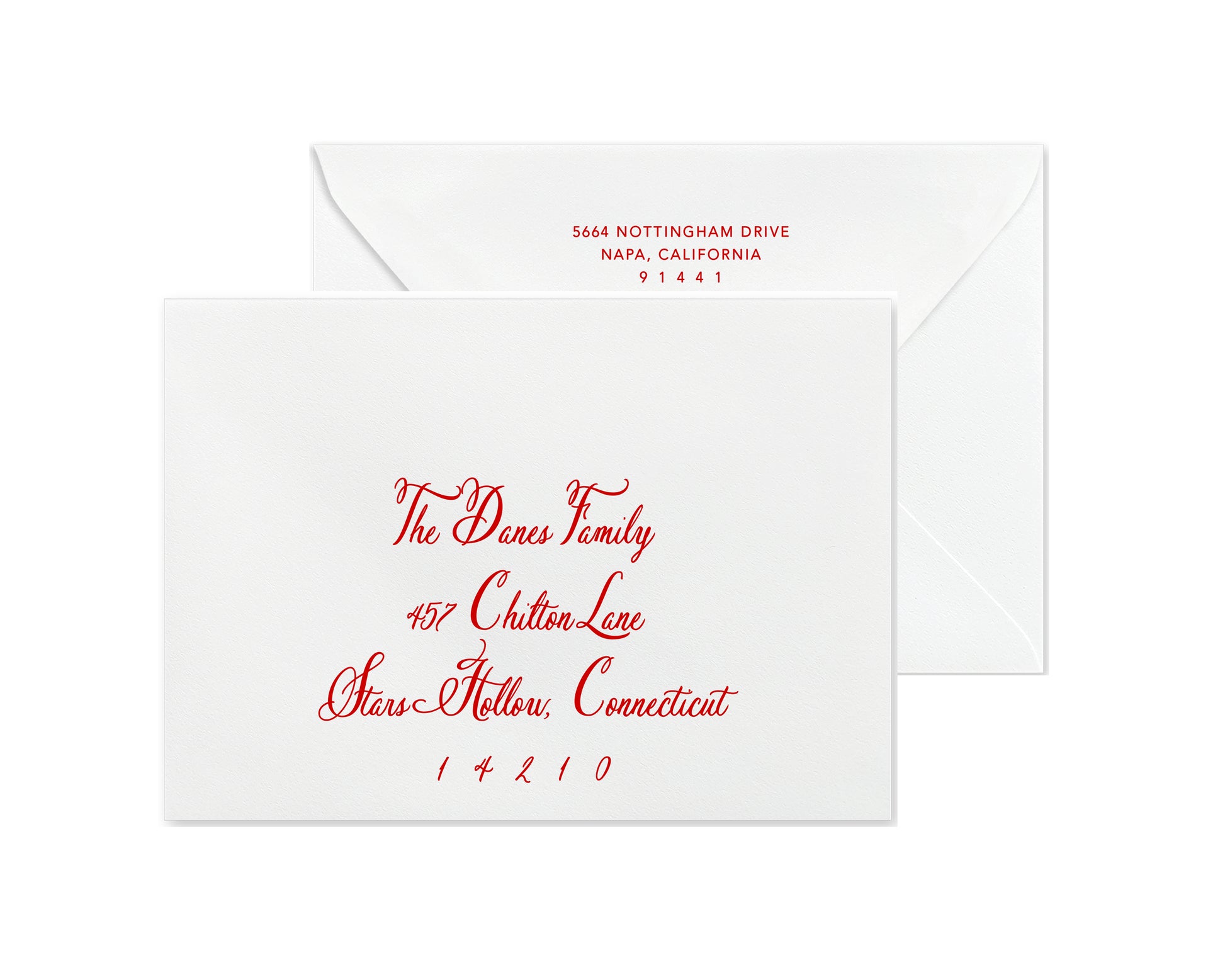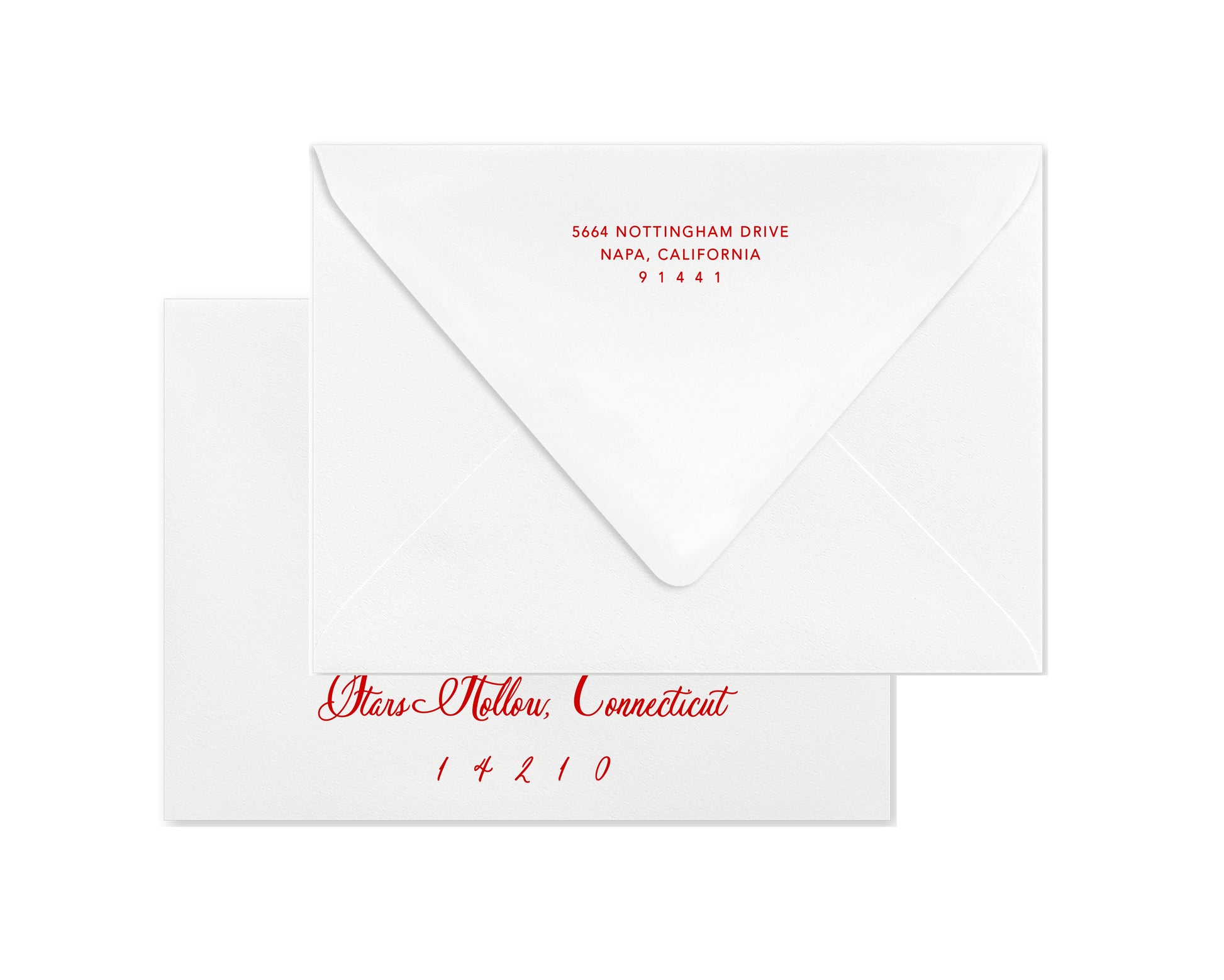 Each card comes with free return address printing on back flap of envelope. Want to add recipient address printing to your envelopes? Simply select “Recipient Address Printing”. Once order is confirmed, we will email you formatting instructions for your address printing!