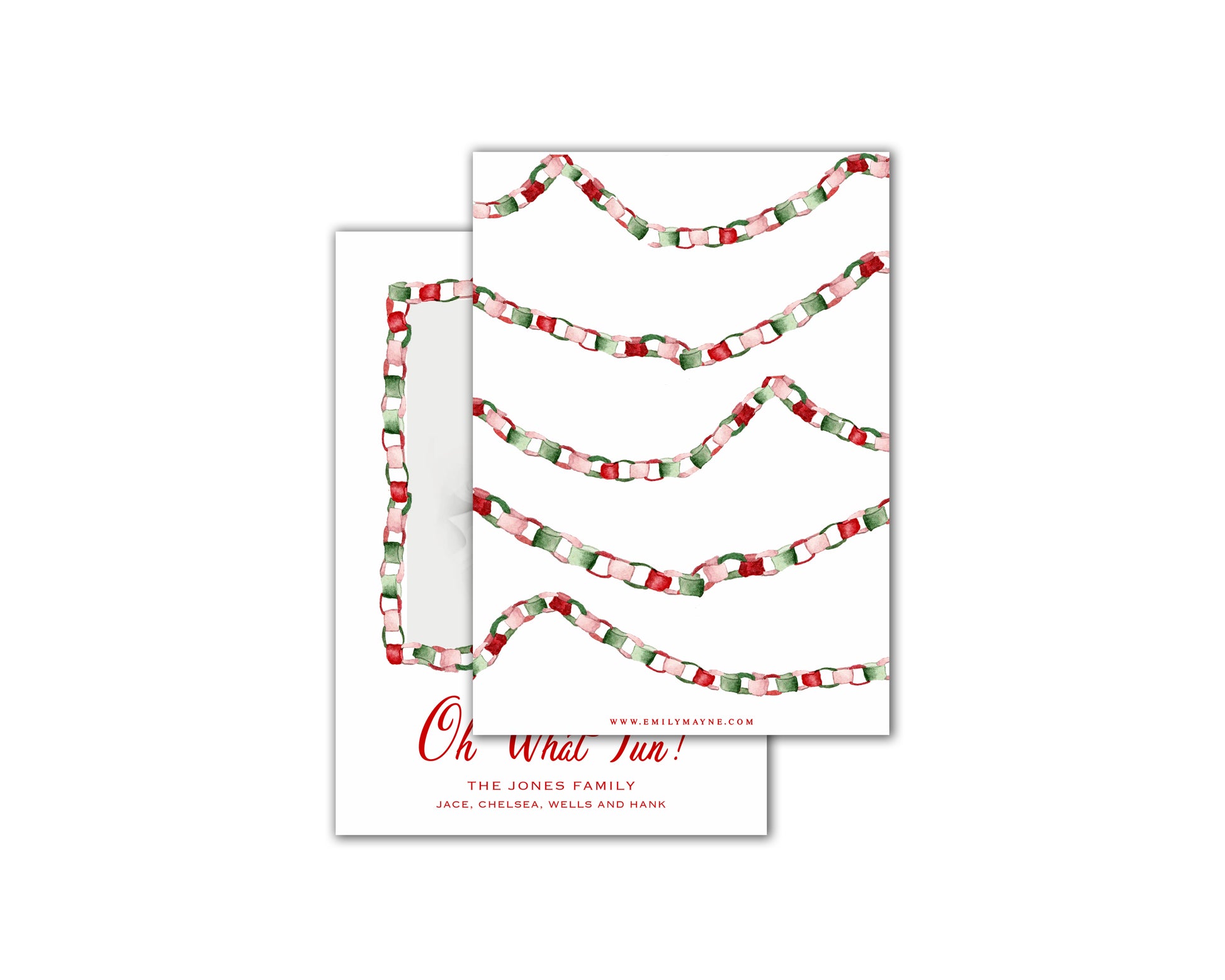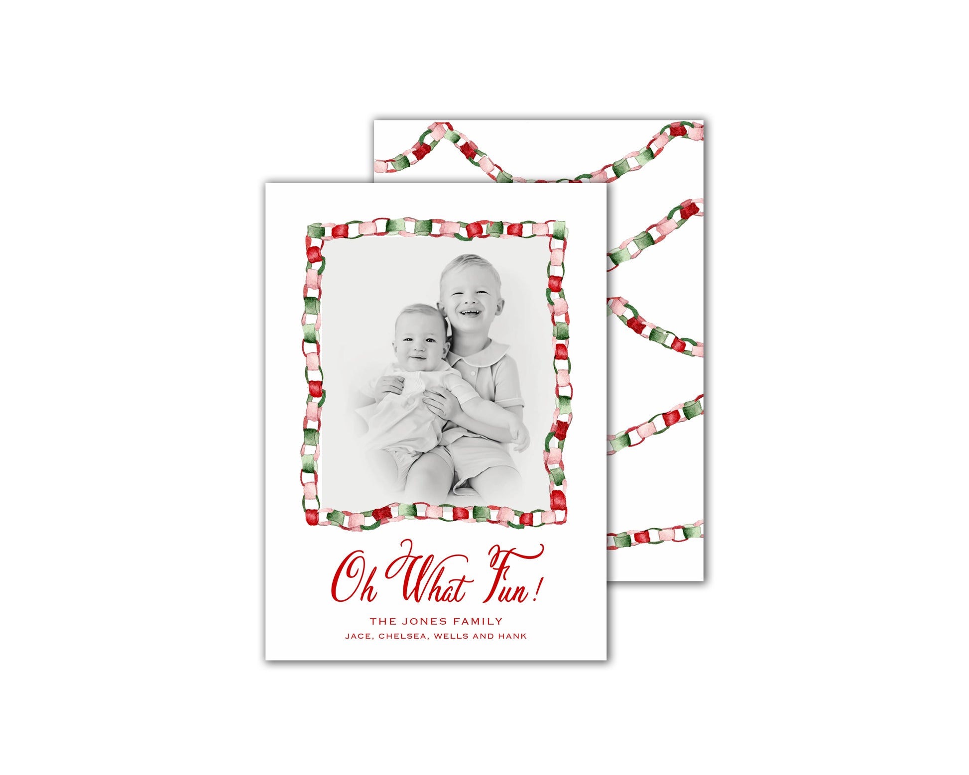 Bring a touch of playful nostalgia to your holiday greetings with our paper chain Christmas cards. Inspired by the classic handmade garlands of childhood, this design frames your family photo with festive hand-painted chains. Share your holiday spirit in a cheerful way to celebrate the season!