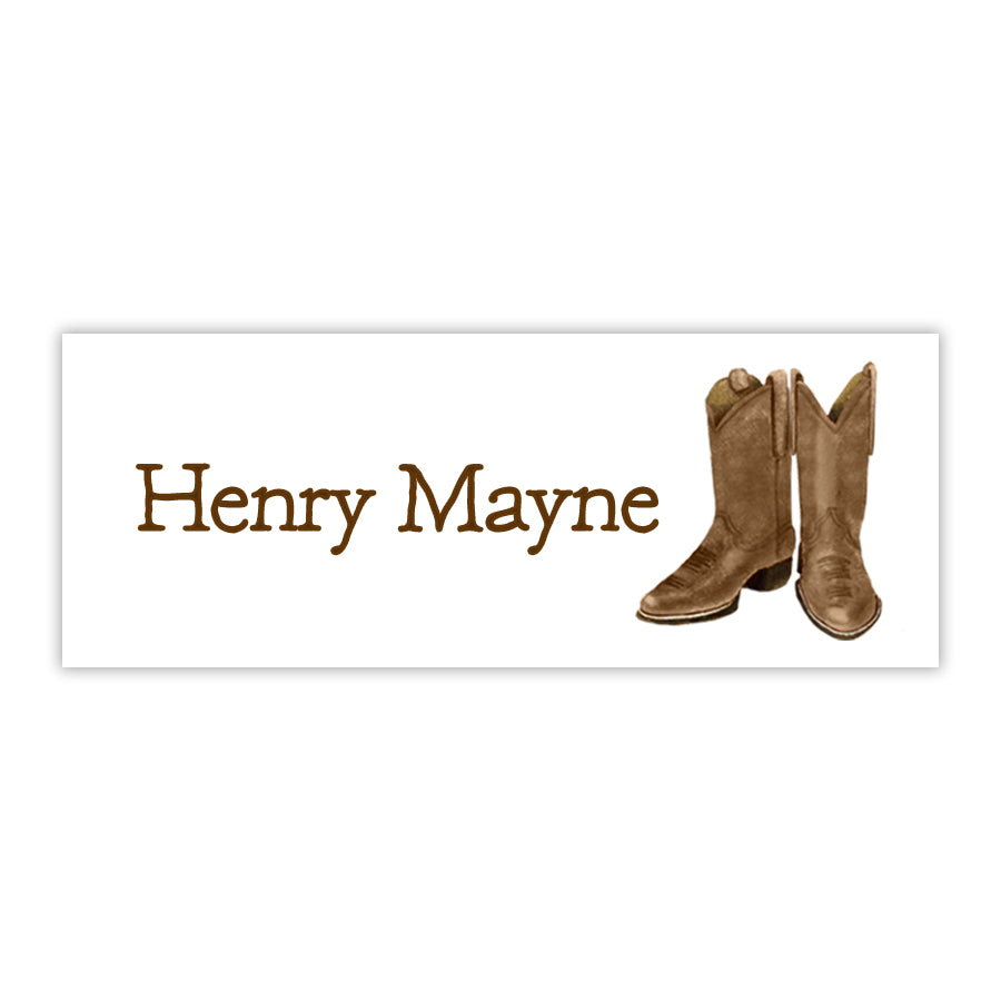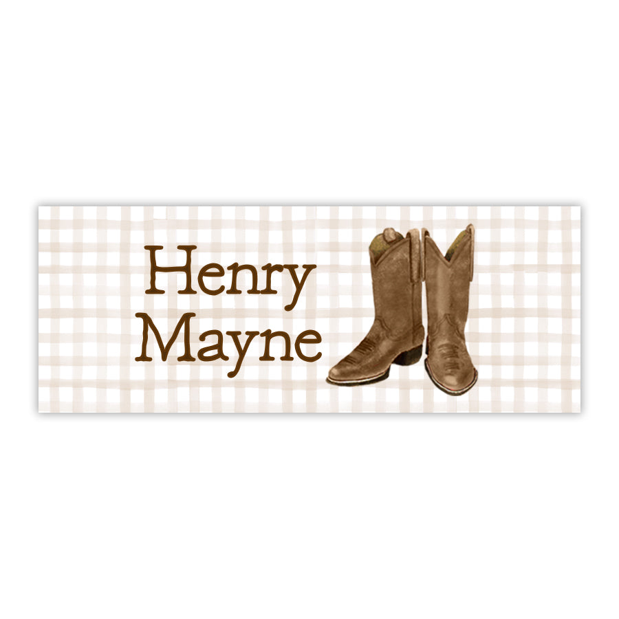 Set of 60 1x2.625” water resistant personalized labels. Featuring hand-painted brown boots and gingham, these personalized children’s labels are perfect for your child's sippy cups, water bottles, lunch boxes, folders, and more. Choose from a light brown gingham background, brown gingham boarder, or solid white background with brown personalization. Water-resistant labels are not recommended for dishwasher use; Hand-washing is best!