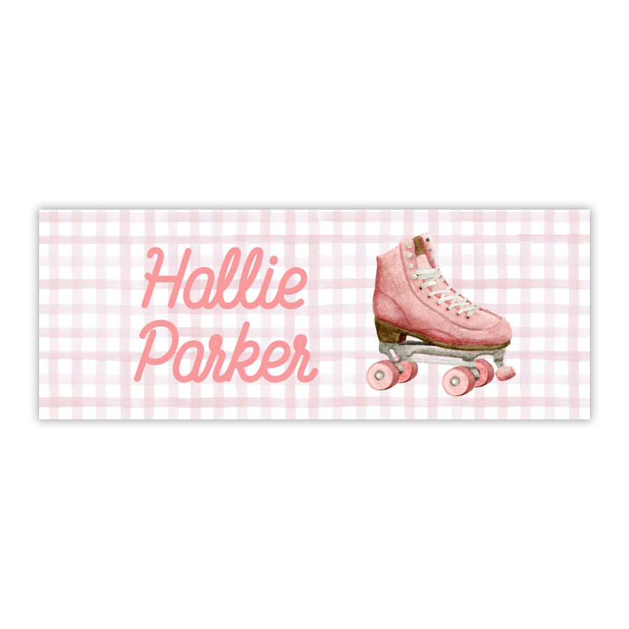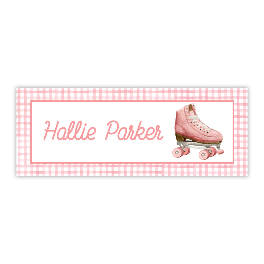 Set of 60 1x2.625” water resistant personalized labels. Featuring a hand-painted roller skate and gingham, these personalized children’s labels are perfect for your child's sippy cups, water bottles, lunch boxes, folders, and more. Choose from a light pink gingham background, pink gingham boarder, or solid white background with pink personalization. Water-resistant labels are not recommended for dishwasher use; Hand-washing is best!