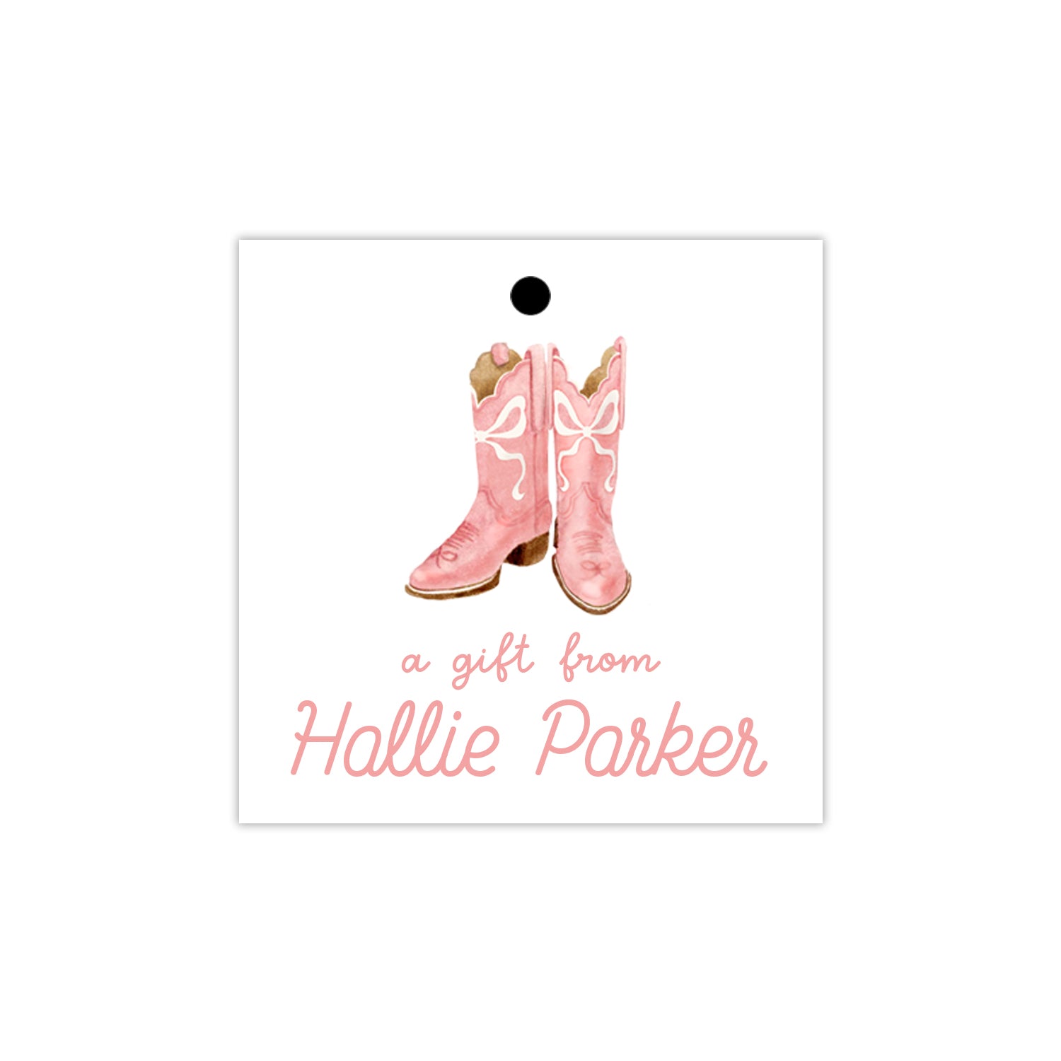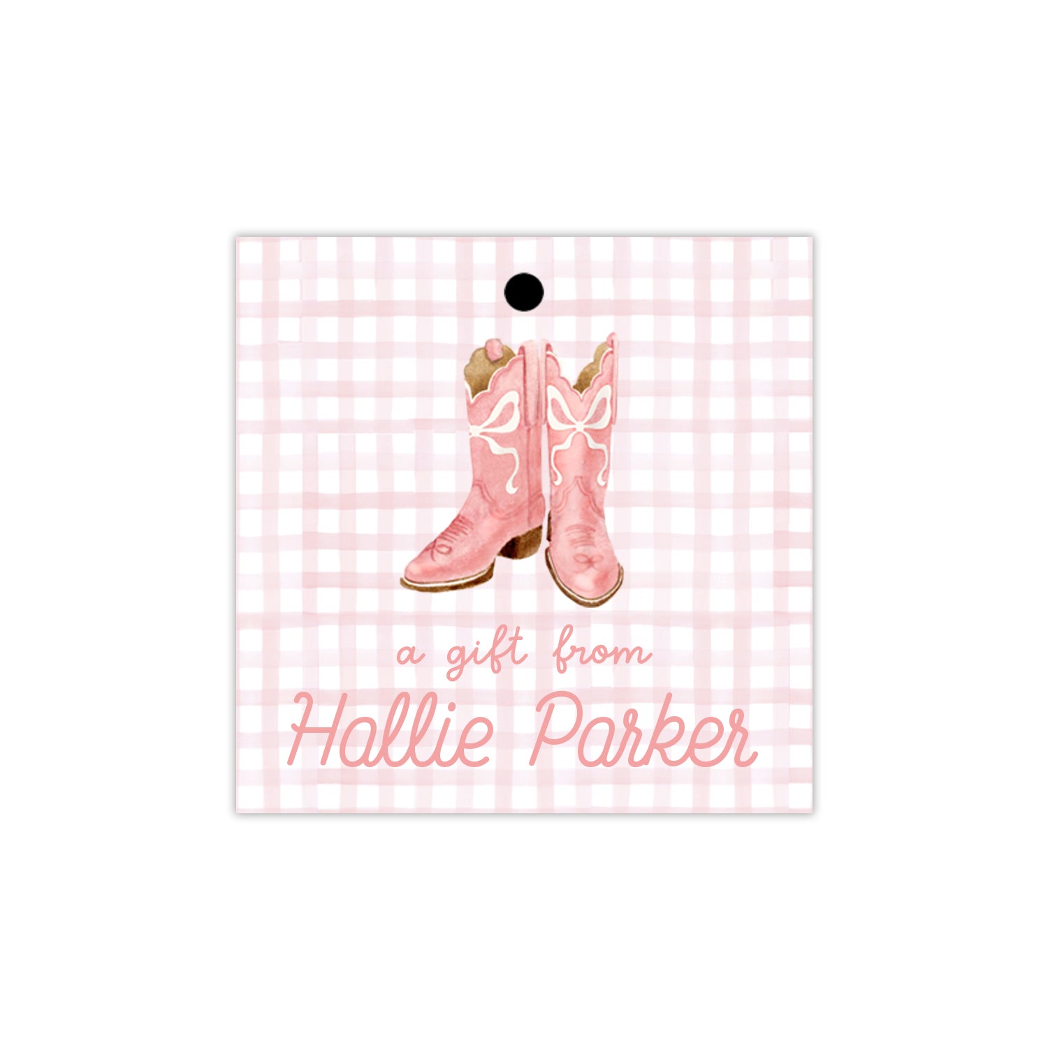 Featuring hand-painted pink boots and gingham, this personalized children’s gift tag is perfect for birthday parties, teacher appreciation gifts, and more. Comes with a convenient hole punch and string for easy attachment for gifting. Choose from a light pink gingham background, pink gingham border, or solid white background with pink personalization.