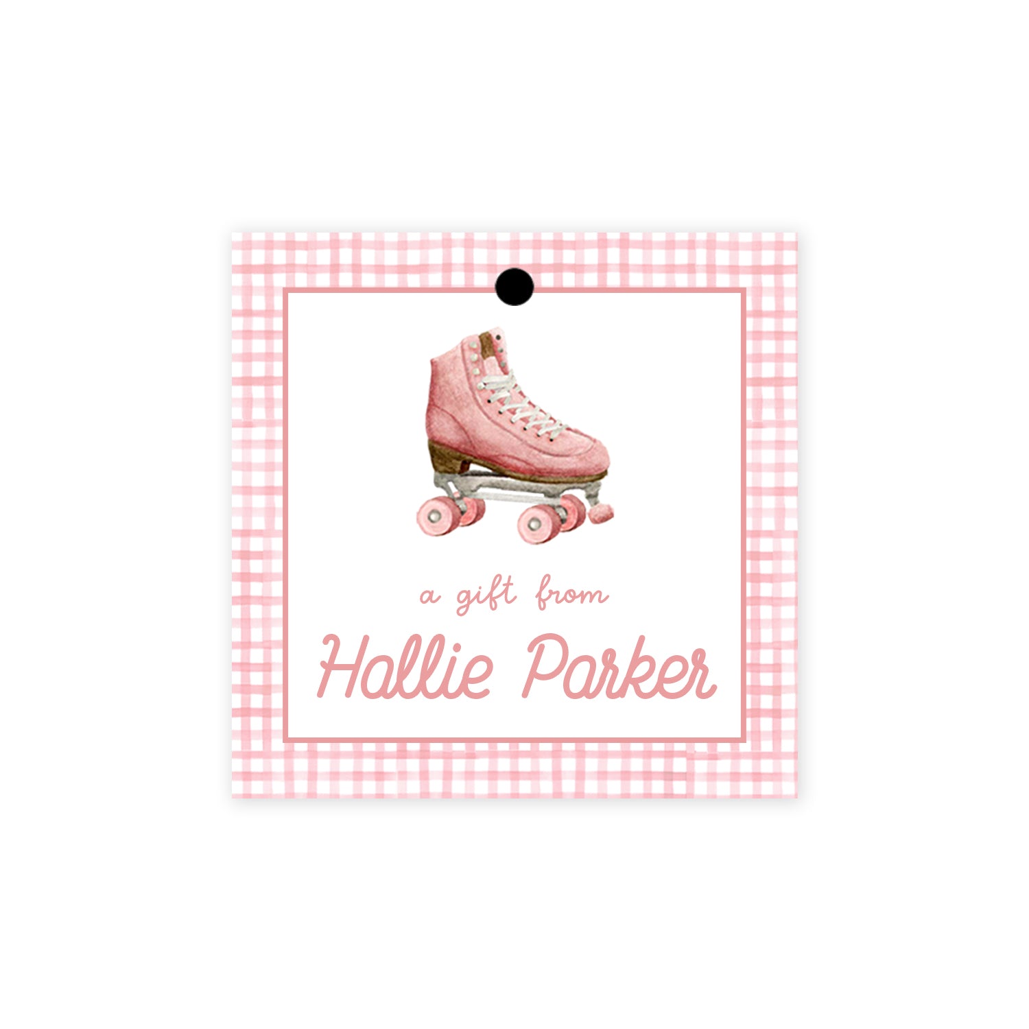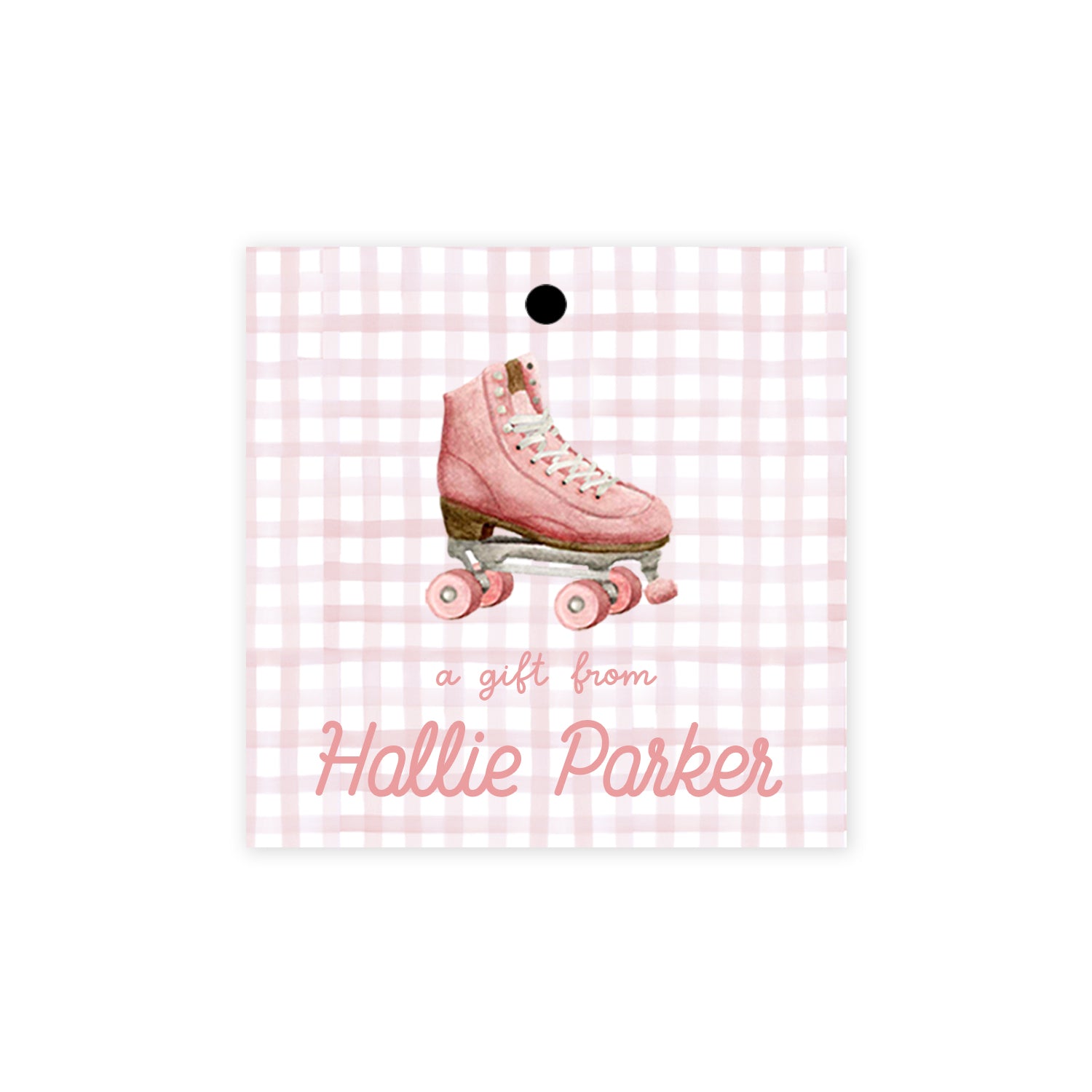 Featuring a hand-painted roller skates and gingham, this personalized children’s gift tag is perfect for birthday parties, teacher appreciation gifts, and more. Comes with a convenient hole punch and string for easy attachment for gifting. Choose from a light pink gingham background, pink gingham boarder, or solid white background with pink personalization.