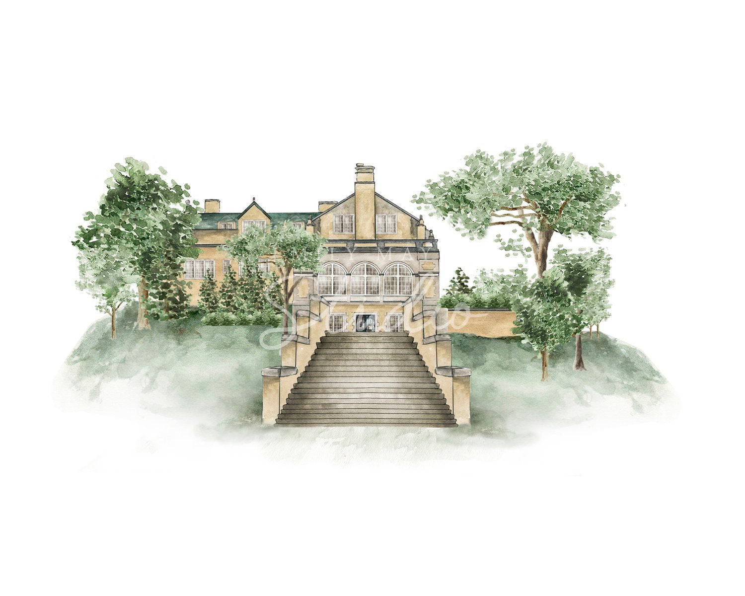 Commemorate your wedding with a hand-painted watercolor rendering of your venue by Emily Mayne. Choose from our library and keepsake or gift it as a large scale print, or even download it as a digital file to use for your own wedding paper good needs.