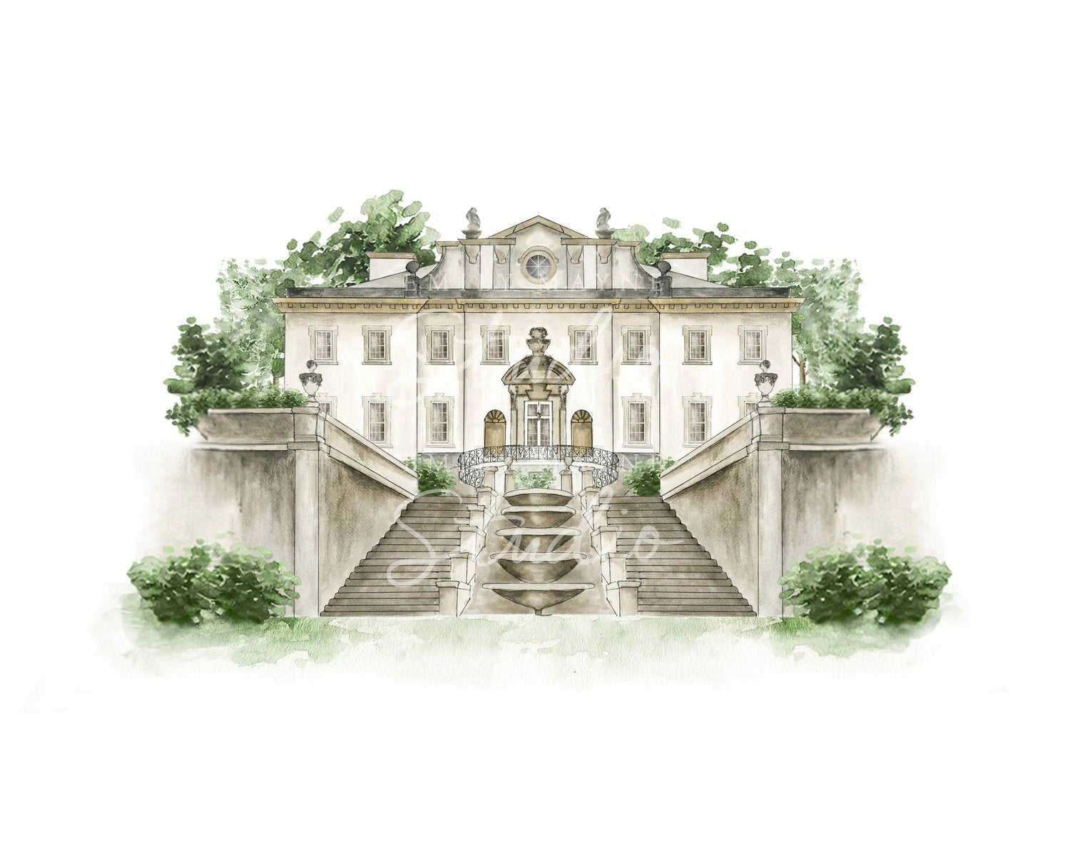 Commemorate your wedding with a hand-painted watercolor rendering of your venue by Emily Mayne. Choose from our library and keepsake or gift it as a large scale print, or even download it as a digital file to use for your own wedding paper good needs.