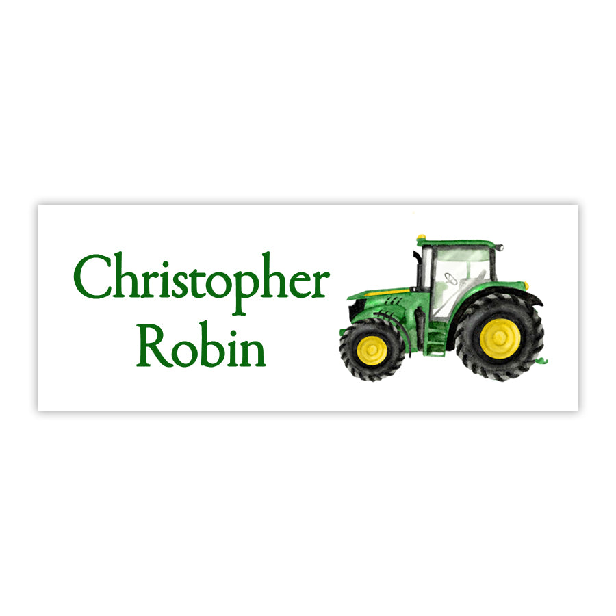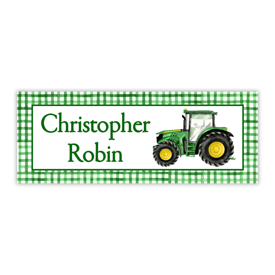 Set of 60 1x2.625” water resistant personalized labels. Featuring a hand-painted tractor and gingham, these personalized children’s labels are perfect for your child's sippy cups, water bottles, lunch boxes, folders, and more. Choose from a light green gingham background, green gingham boarder, or solid white background with green personalization. Water-resistant labels are not recommended for dishwasher use; Hand-washing is best!