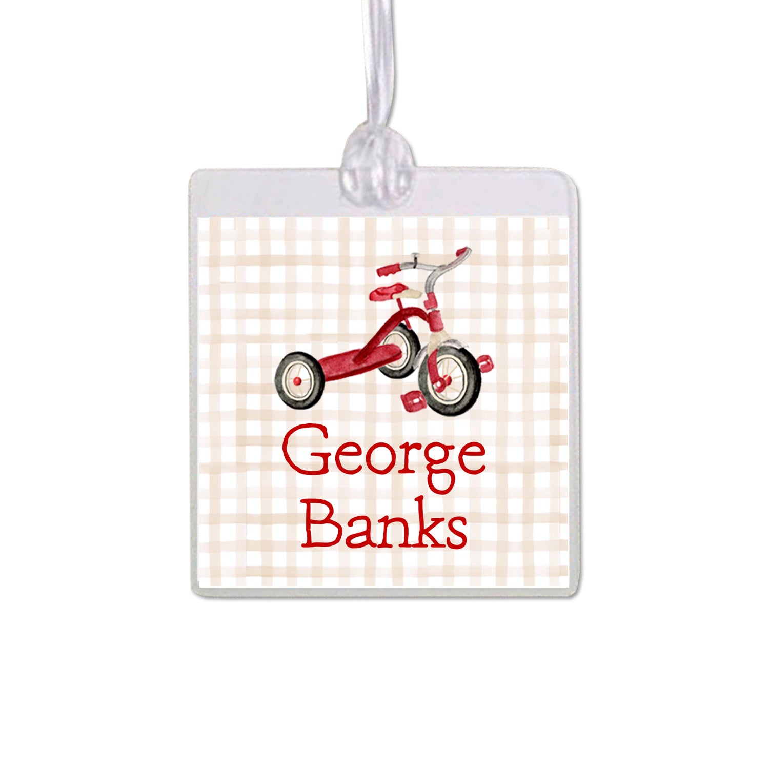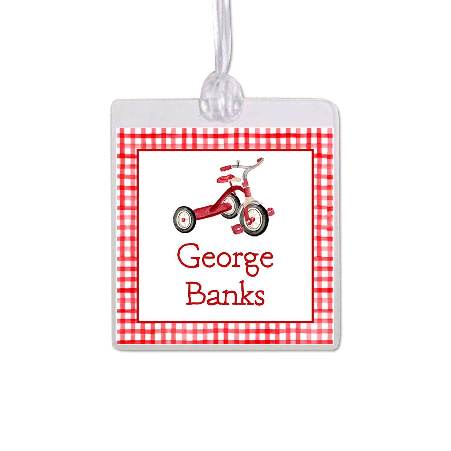 Laminated 2.75” Square bag tag printed on 110 lb. white cardstock. Also comes with a plastic lanyard for attaching to backpacks, lunch boxes, diaper bags, luggage and more! Featuring a hand-painted tricycle, choose from a tan gingham background, red gingham border, or solid white background with green personalization.