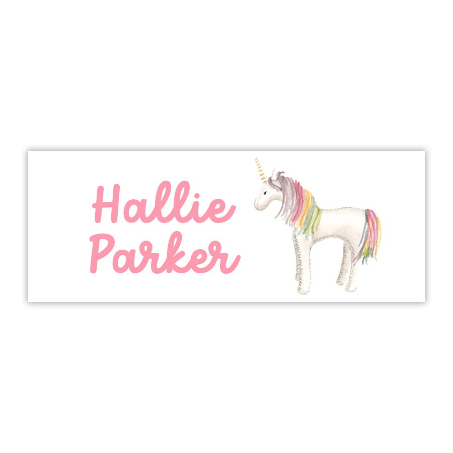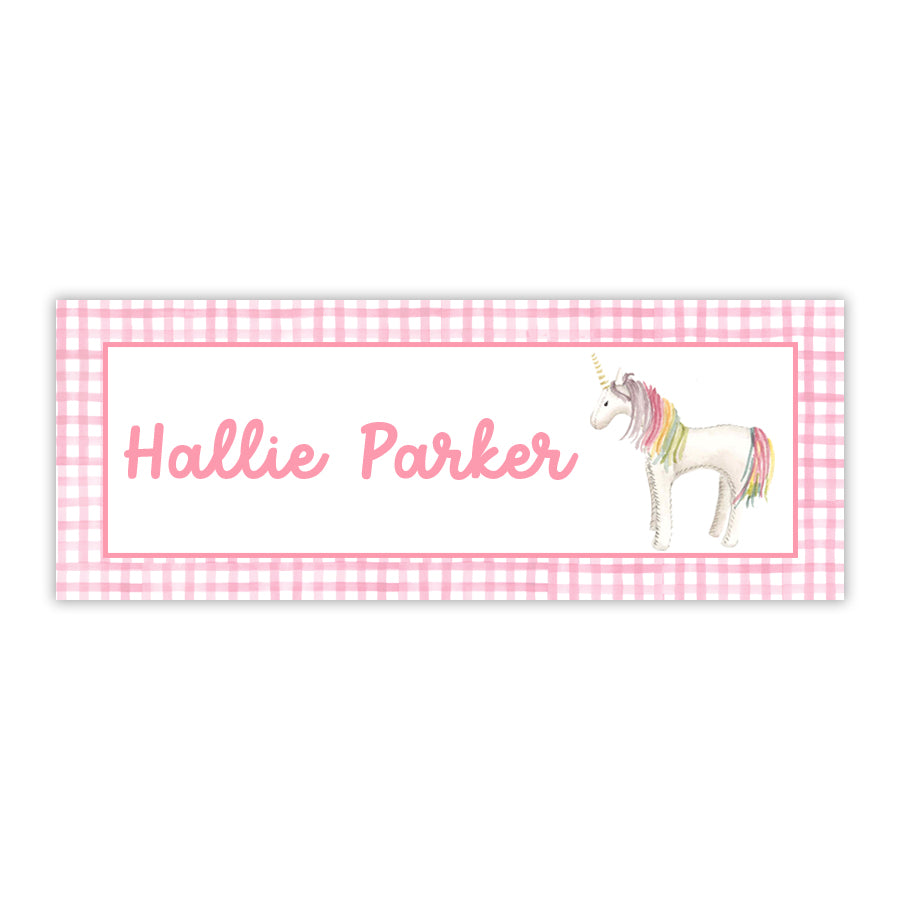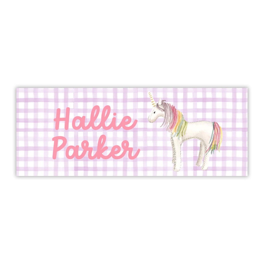 Set of 60 1x2.625” water resistant personalized labels. Featuring a hand-painted unicorn and gingham, these personalized children’s labels are perfect for your child's sippy cups, water bottles, lunch boxes, folders, and more. Choose from a lavender gingham background, pink gingham boarder, or solid white background with pink personalization. Water-resistant labels are not recommended for dishwasher use; Hand-washing is best!